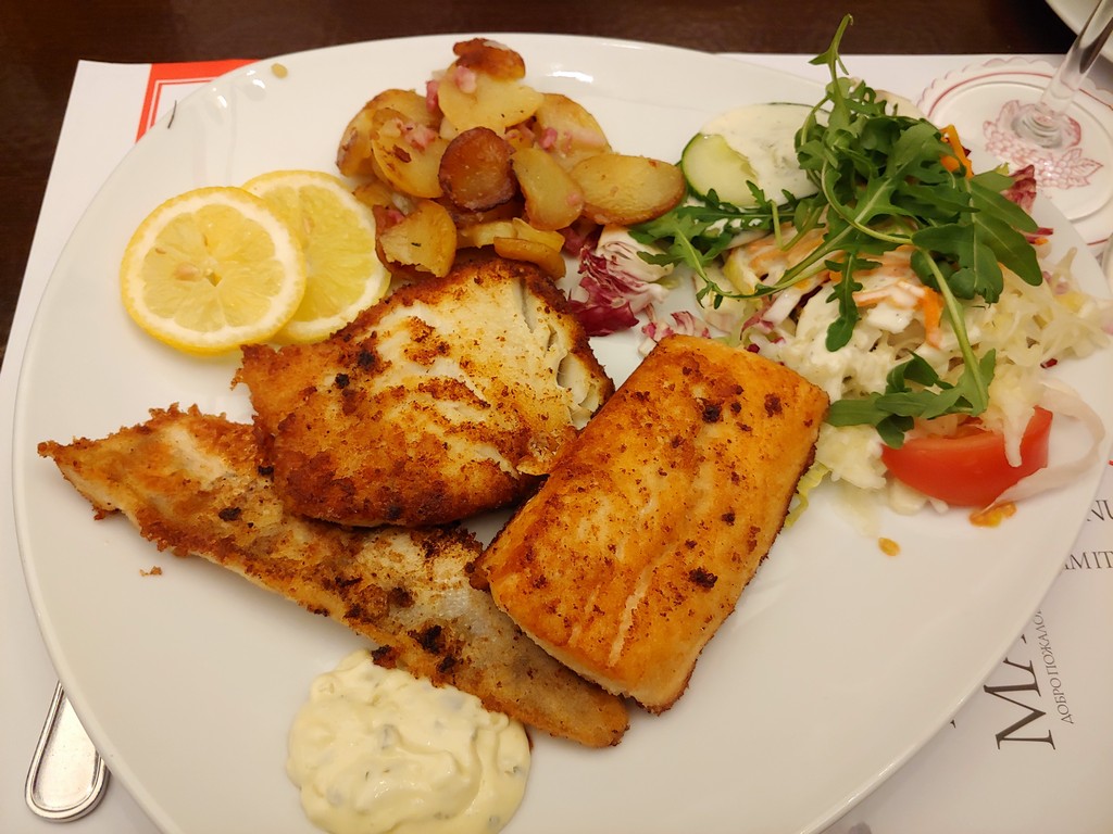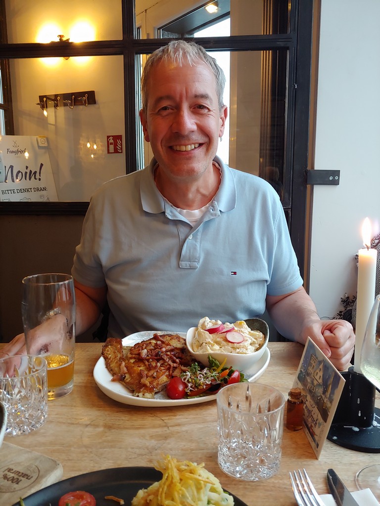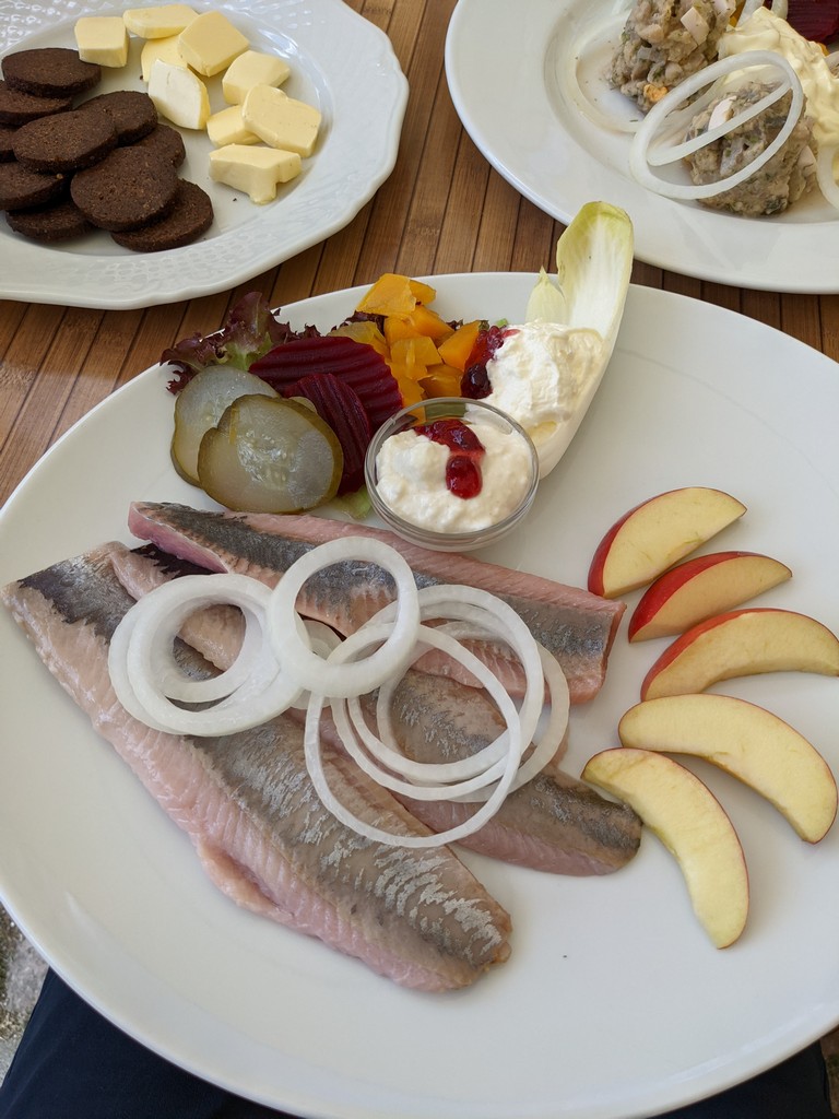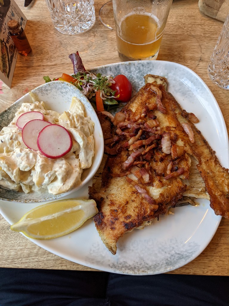 Der Tag war ziemlich warm, wir hatten schon einige Meter gemacht und beschlossen, im Ratskeller Mittagspause zu machen. Wir kriegten draußen einen schönen Platz und bestellten uns etwas von der Heringskarte. Es war sehr lecker.