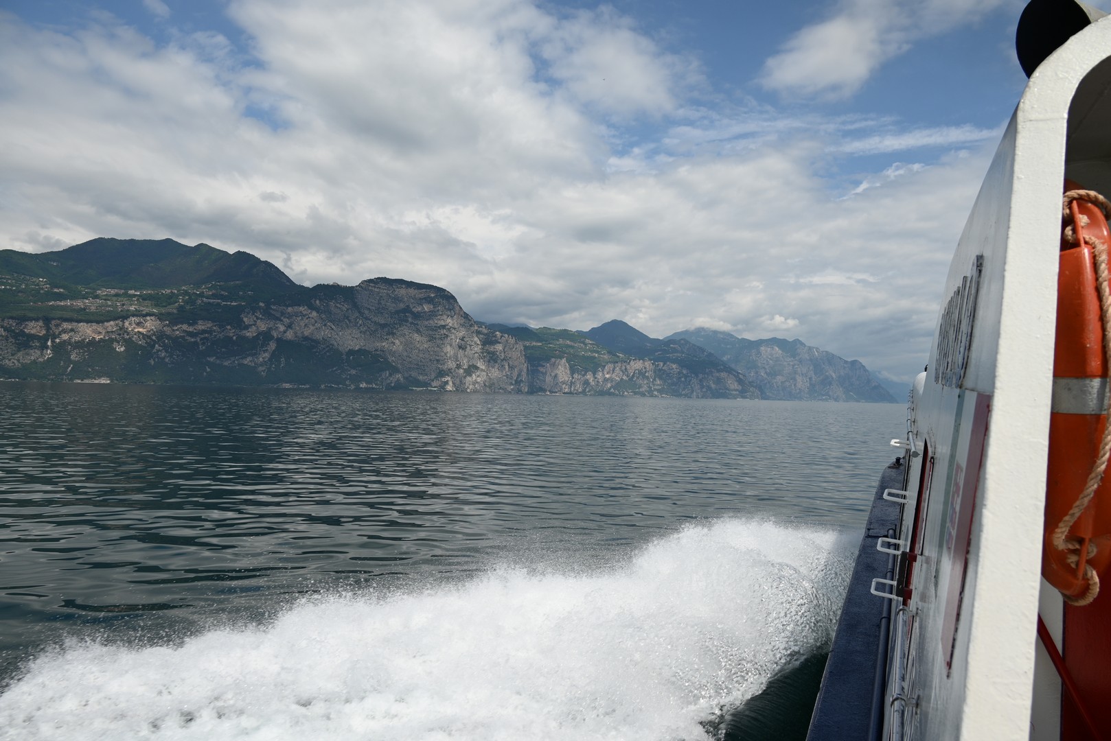 Unser zweiter Ausflug fand hauptsächlich auf Fähren auf dem Gardasee statt. Cisano liegt am unteren Teil des Sees und wir wollten nach Riva, das im Norden des Sees liegt. Wir stiegen in der Nähe unseres Hotels in eine Fähre und fuhren nach Garda. Hier mussten wir umsteigen und fuhren dann über mehrere Stationen bis nach Riva. Insgesamt waren wir 3 Stunden unterwegs und konnten uns so einen guten Eindruck von mehreren Städten am Gardasee und vom See selbst verschaffen. Wir haben die Fahrt sehr genossen, denn uns hat der Anblick des Sees, der in den Bergen liegt, sehr gut gefallen.