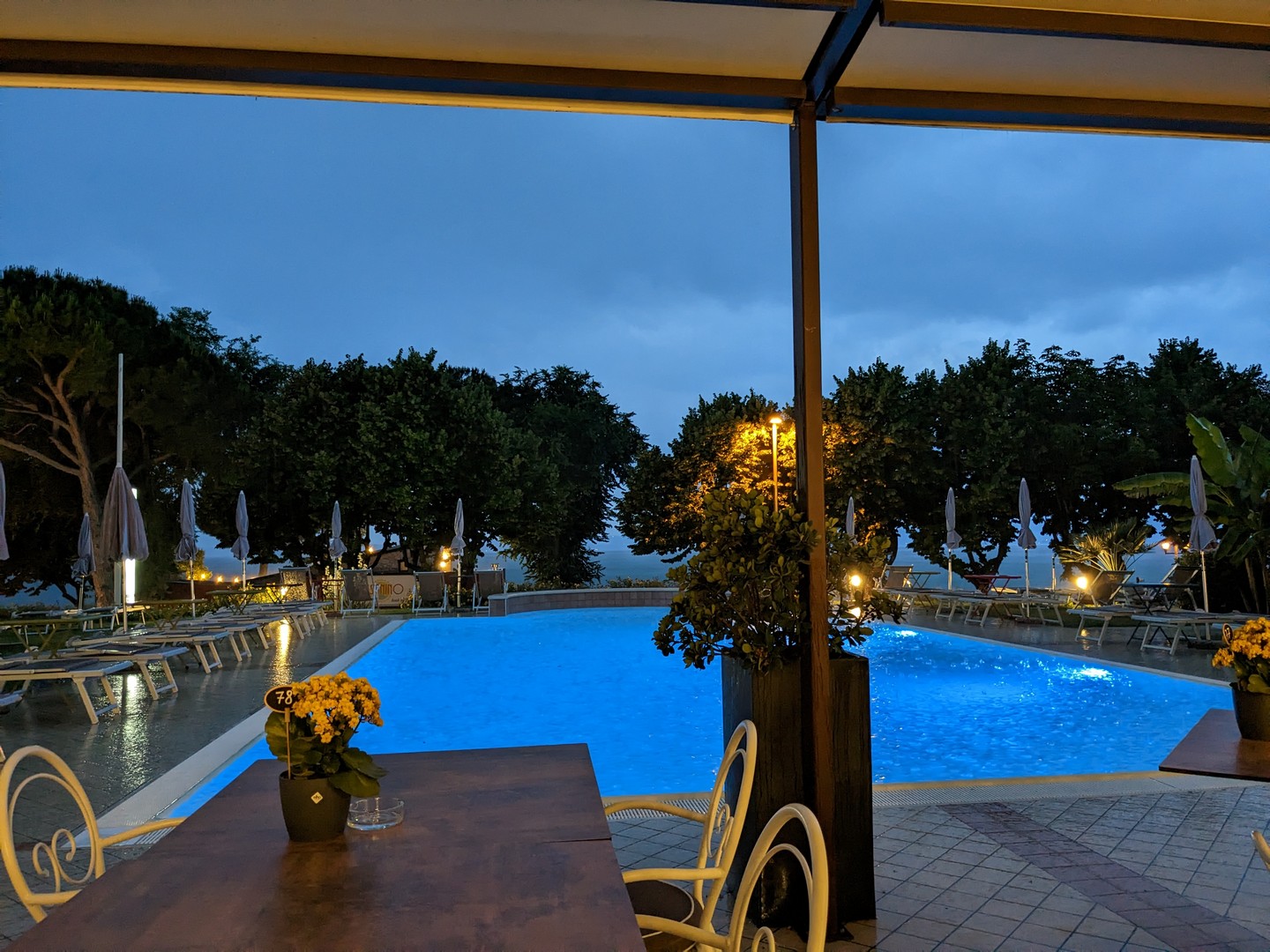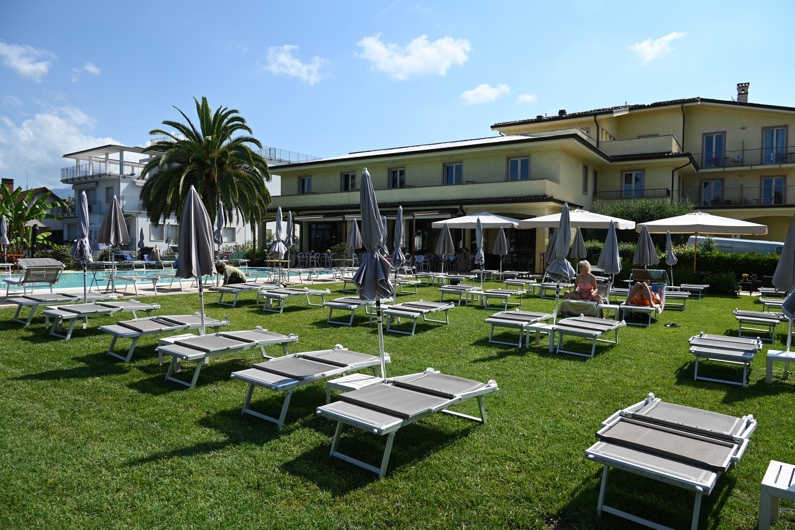 Da wir eine Weile brauchten, um den Busfahrplan zu verstehen, waren wir schließlich zu spät und hätten länger warten müssen bis zum nächsten Bus, also nahmen wir ein Taxi. Dies brachte uns zu unserem Hotel San Marco in Cisano, Bardolino. Es ist ein 3 Sterne Hotel in zweiter Reihe vom Gardasee. Da die erste Reihe hier aus einem Park besteht, d.h. nicht bebaut ist, konnten wir den Gardasee von der Hotelterrasse aus sehen. Uns hat es hier sehr gut gefallen. Alle Hotelangestellen waren sehr nett, die Zimmer sind einfach aber gut ausgestattet, alles ist sehr sauber, das Frühstück war klein aber fein und ließ keine Wünsche offen. Der Pool befindet sich in einem Garten mit vielen Liegen und Schirmen. Da die meisten nicht beweglich sind, haben wir immer unter einer großen Palme gelegen.