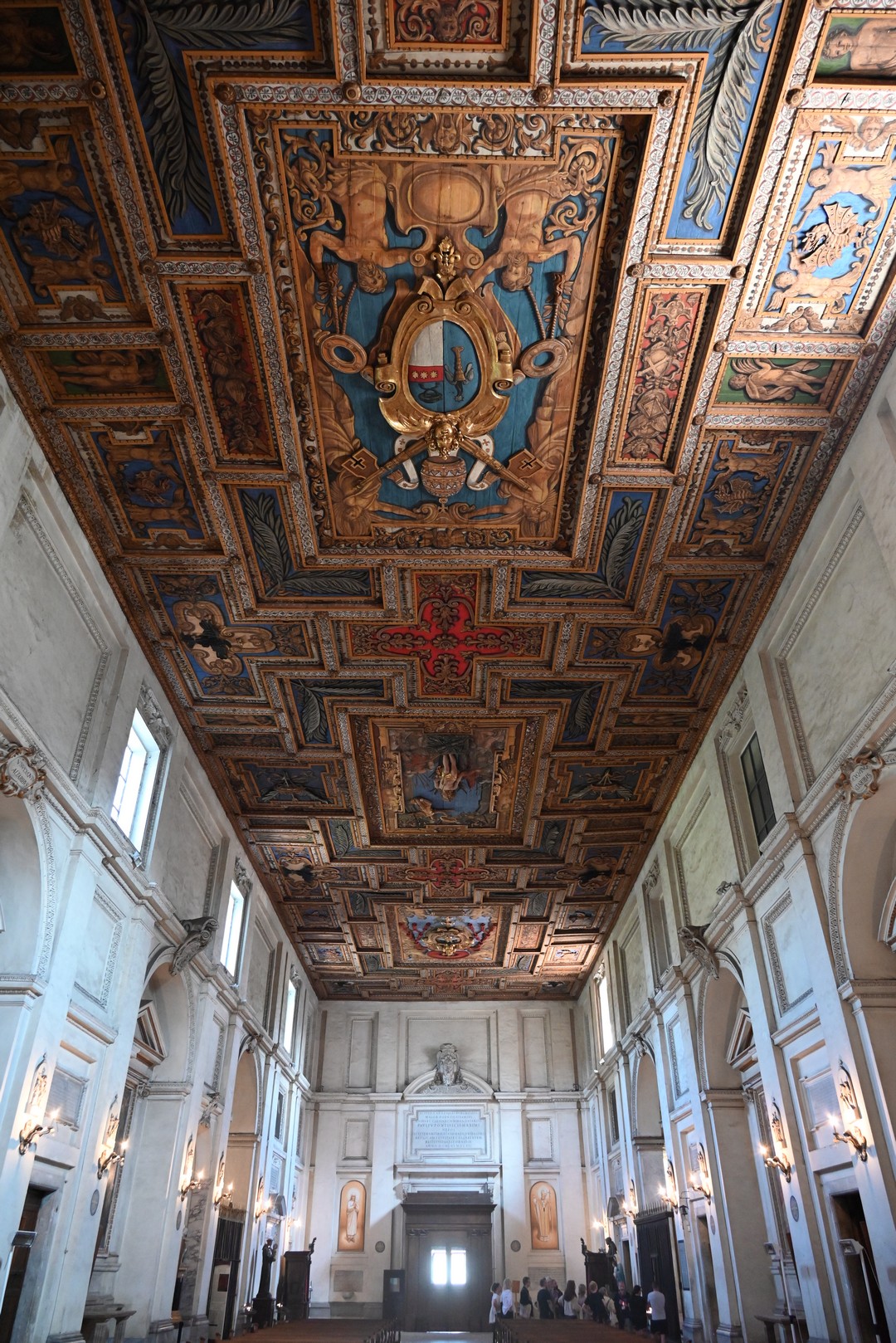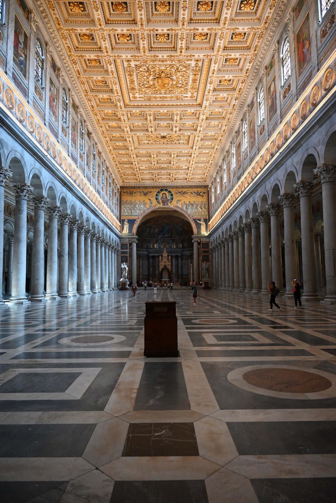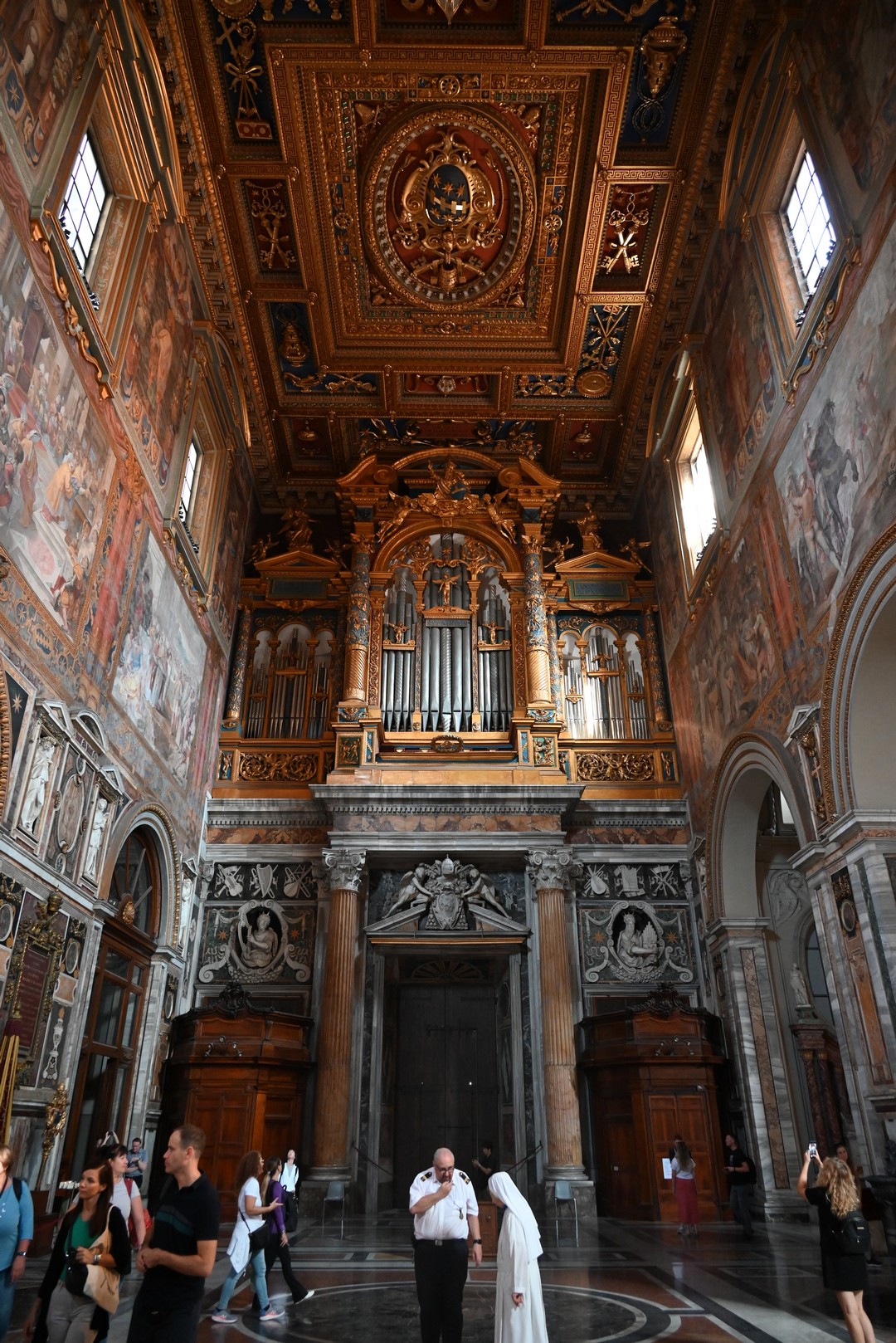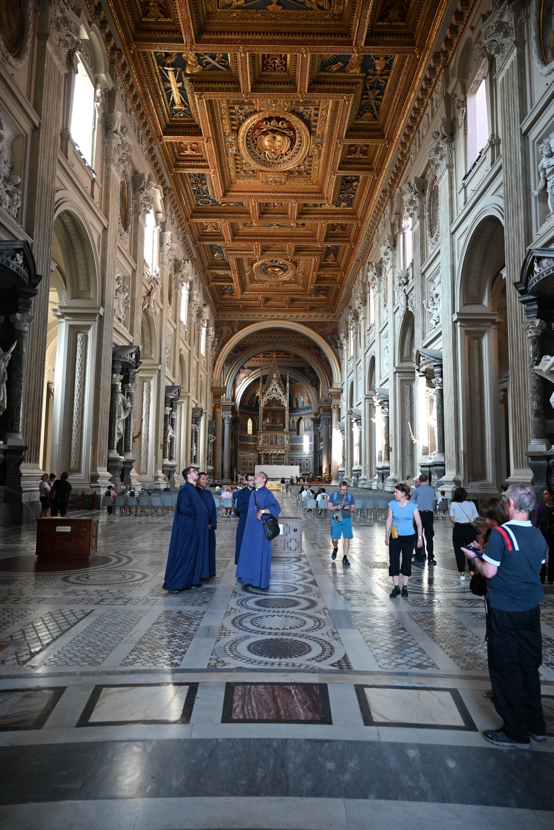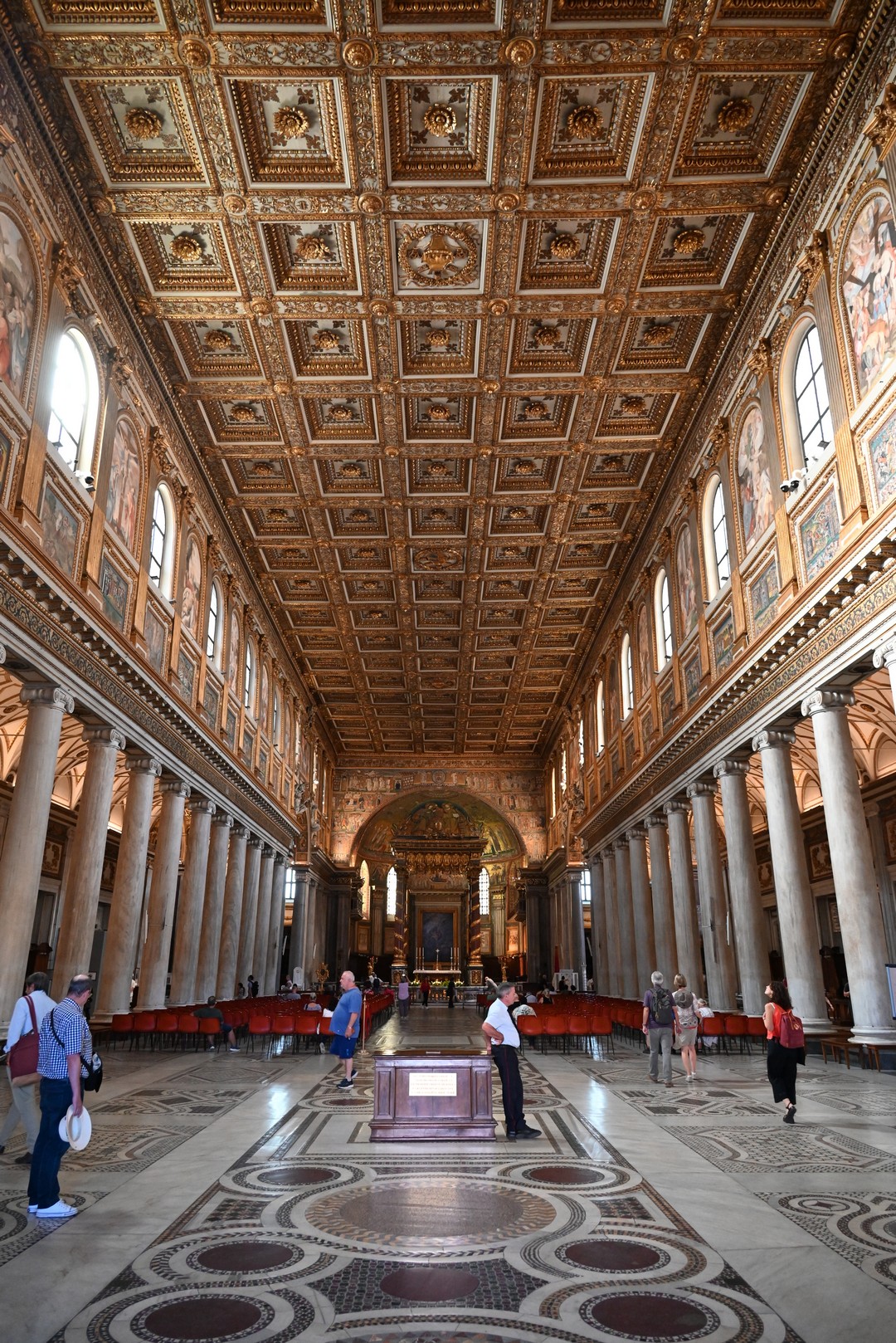 Anschließend bezogen wir unser Zimmer, zogen uns um, denn in Rom waren es fast 30° C und gingen wieder los zu den ersten Sehenswürdigkeiten auf unserer Liste. An die erste Kirche, die wir besichtigten, Santa Maria Maggiore hatte ich einige Erinnerungen von meiner Abifahrt. Damals hatten wir ein Hotel in der Nähe und saßen abends immer auf den Treppenstufen herum. Heute geht das nicht mehr, da alles abgesperrt ist, weil es eine Sicherheitskontrolle vor dem Eingang gibt. Die Kirche empfanden wir als sehr sehenswert, vor allem die Decke beeindruckte uns. Eine Decke in dieser Form haben wir danach noch ein paar Mal in Rom gesehen.