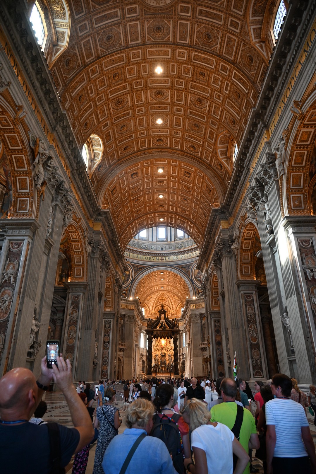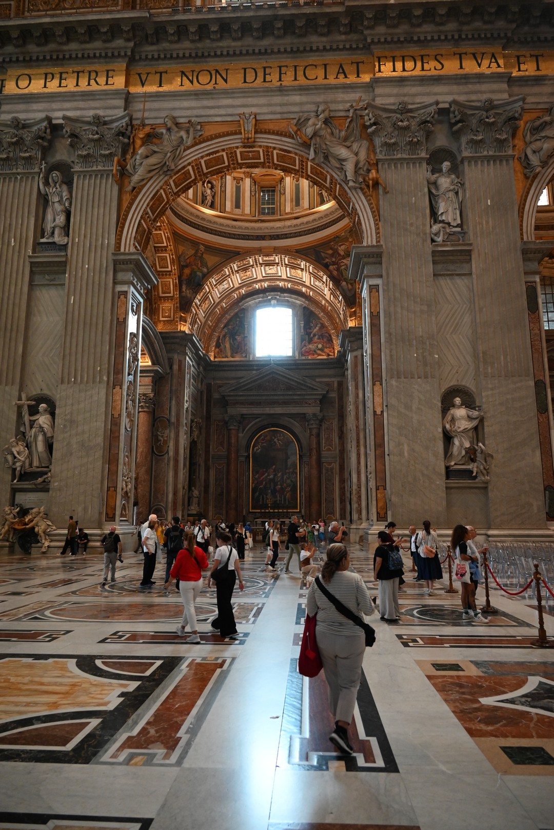 Auch die Schlange am Petersdom war unglaublich lang, aber wir hatten Tickets und hofften so, dass wir uns nicht anstellen müssten. Leider hofften wir vergebens, denn die Schlange war für die Sicherheitskontrolle, durch die natürlich jeder muss. So standen wir ca. 45 Minuten in der prallen Sonne an und hörten unserer Führerin zu, wie sie uns einiges zum Petersdom und Rom erzählte. Das Warten hat sich unserer Meinung aber gelohnt, der Petersdom ist definitiv ein Muss.
