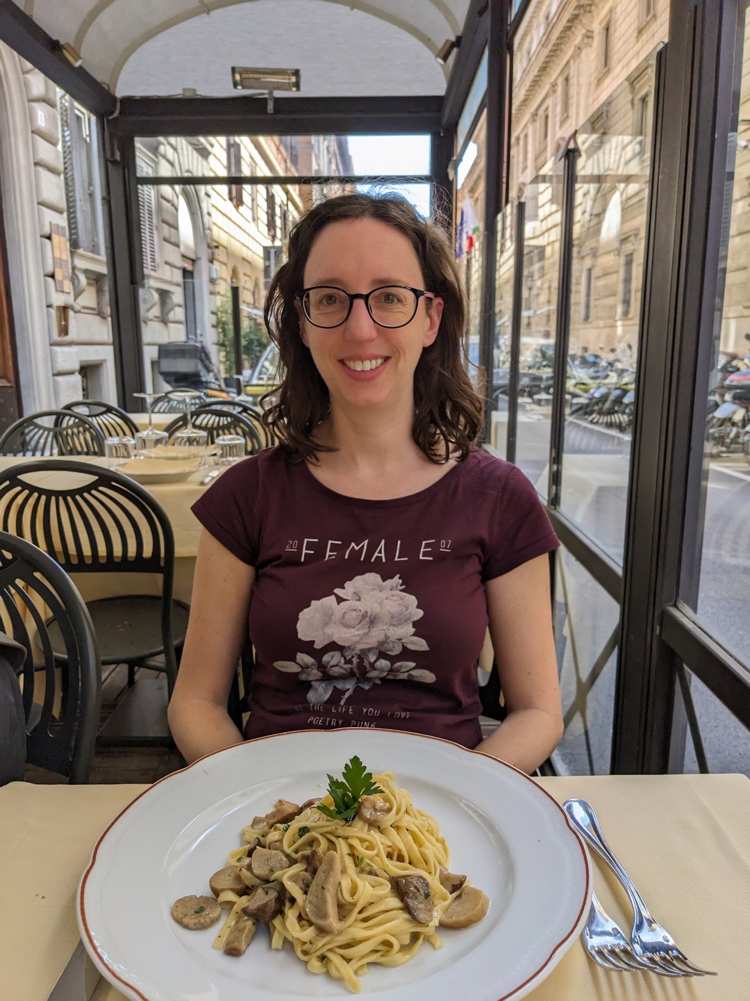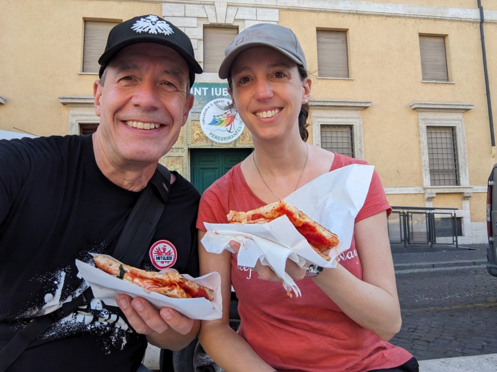 Aufgrund der langen Wartezeit vorher und ein paar Vorfälle während der Führung dauerte alles länger als gedacht und so kamen wir erst gegen 17 Uhr zu einem kleinen Mittagessen. Ich konnte mich von meiner Abifahrt daran erinnern, dass es überall Pizzerien gibt, wo man kleinere Stücke kaufen und im Stehen essen kann. So eine fanden wir in der Nähe und genossen die erste Pizza in Rom.