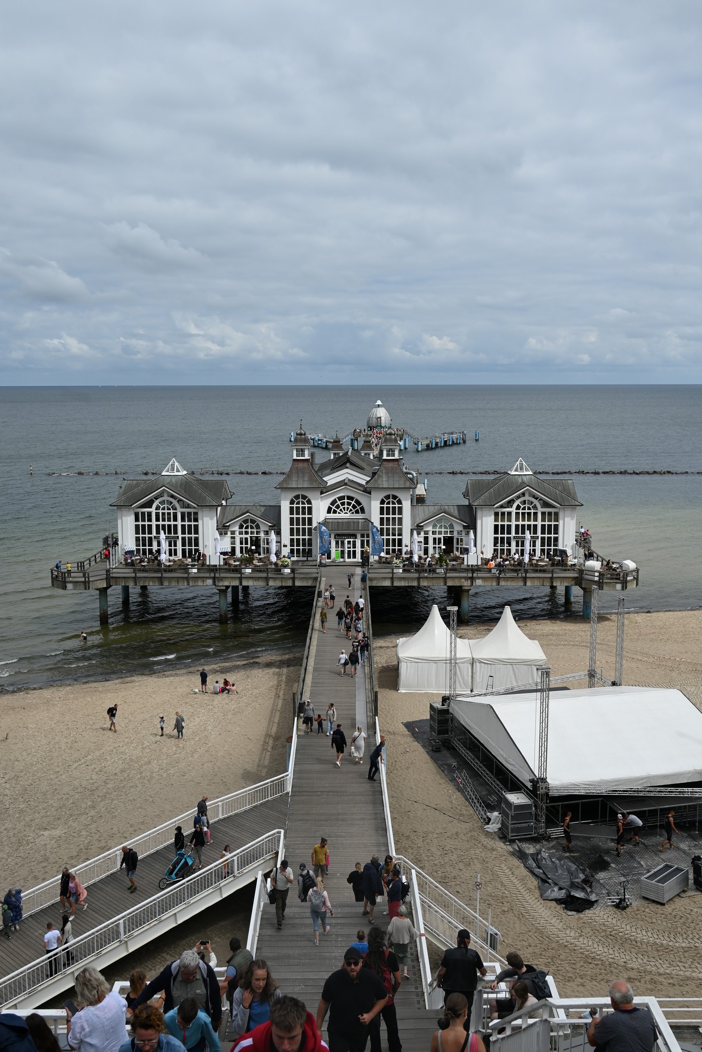 Im Norden fährt man Fahrrad und so hatte Klaus eine Fahrradtour für uns geplant. In der Annahme Rügen wäre flach, mieteten wir uns Tourenräder mit 7 Gängen. Großer Fehler. Direkt hinter Binz ging es bergauf. Unser erstes Ziel war Sellin und die Tour ging durch den Wald. Es ging immer wieder bergauf und bergab, diese Teile des Weges waren außerdem gepflastert, wir nehmen an für Panzer. Mit unseren Fahrrädern ging das nicht gut und so schoben wir im Grunde genauso viel wie wir fuhren. Klaus’ Fahrrad hatte außerdem die falsche Größe, was das Fahren zusätzlich erschwerte. In Sellin angekommen waren wir ziemlich genervt, vor allem von uns selbst und unserer Fehleinschätzung. Die dortige Seebrücke entschädigte aber etwas für die mühselige Fahrt. Von der Stadt aus führt eine Treppe zur Seebrücke runter. Man hat so einen tollen Blick auf die Seebrücke. Genauso kann man sehr schön von der Seebrücke aus zur Küste rauf gucken. Auf der Seebrücke stehen Tafeln, die die Geschichte der Seebrücke, die mehrfach durch das Wetter zerstört wurde, erzählt, was wir sehr spannend fanden.