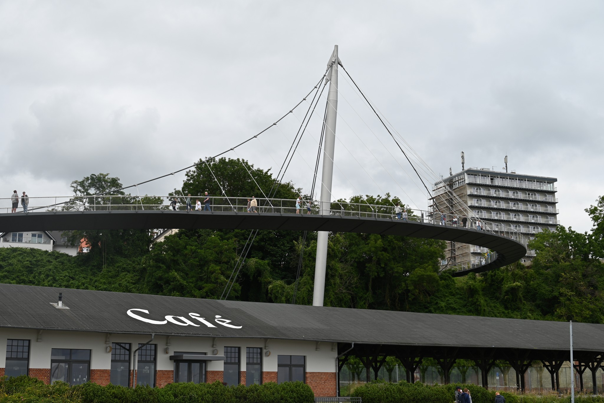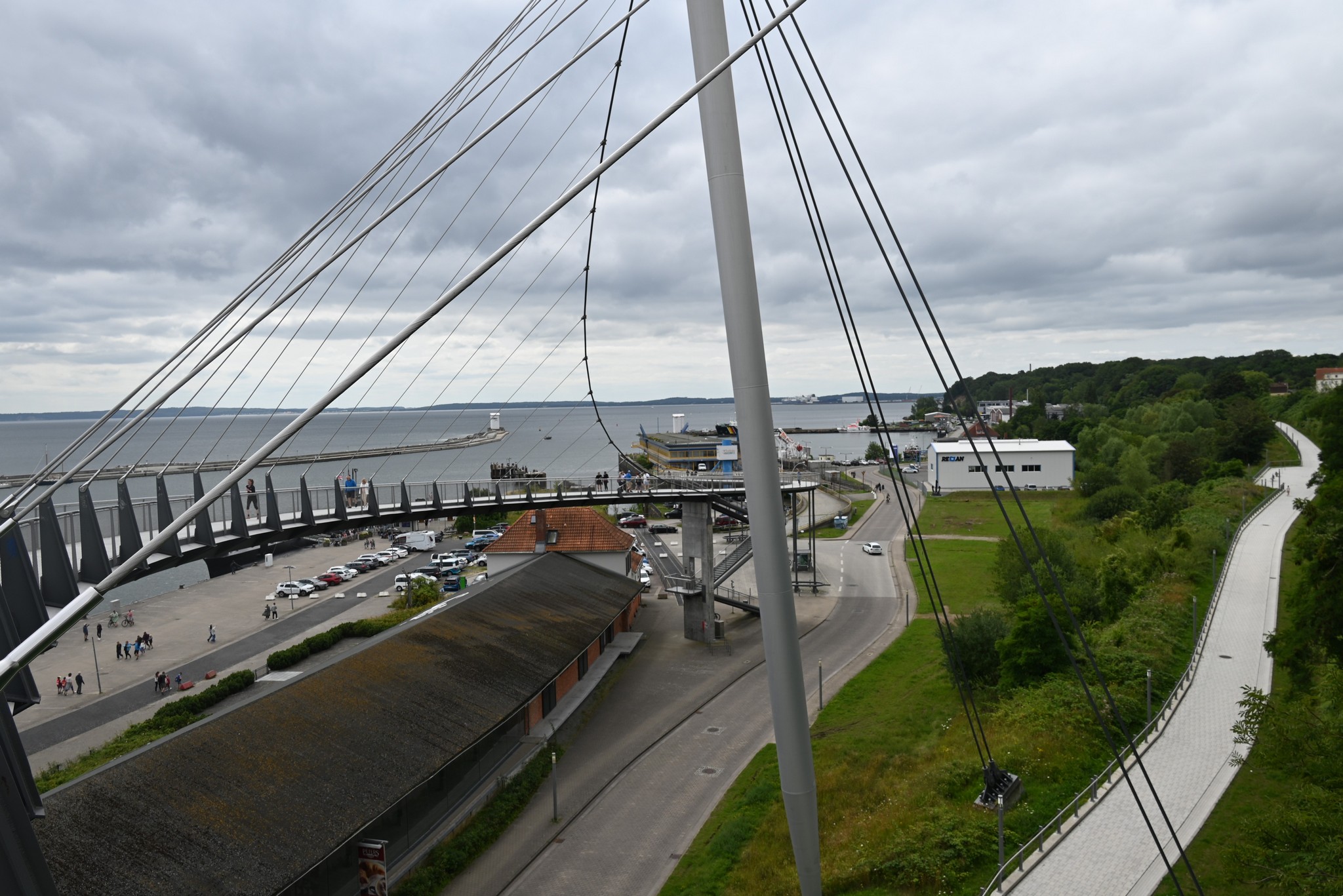 Ein Tag begann sehr verregnet. Nachdem der Regen etwas nachgelassen hatte, wollten wir mit dem Bus nach Sassnitz fahren. In Berchtesgaden können wir mit der Gästekarte die öffentlichen Busse in Berchtesgaden und im Berchtesgadener Land kostenfrei nutzen. In Binz hatten wir die Binzer Bucht Card erhalten und dachten, hier wäre es genauso. Beim Einsteigen in den Bus zeigten wir die Karte vor und erhielten die Anweisung „aussteigen, Stadtbus nehmen“. Die Karte gilt wohl nur innerhalb von Binz. Also stiegen wir wieder aus und realisierten erst nachdem der Bus weggefahren war, dass der Stadtbus nicht nach Sassnitz fährt. Eine Stunde auf den nächsten Bus nach Sassnitz zu warten war uns zu lang und so verlegten wir unseren Ausflug auf einen anderen Tag. Dann waren wir schlauer, zeigten die Binzer Bucht Card gar nicht erst vor und zahlten unsere Fahrkarte nach Sassnitz. Die Fahrt dauerte ca. 50 Minuten. Unser Ziel war der Hafen von Sassnitz. Der Weg führt ein Stück durch die Stadt und über eine Hängebrücke runter an den Hafen.