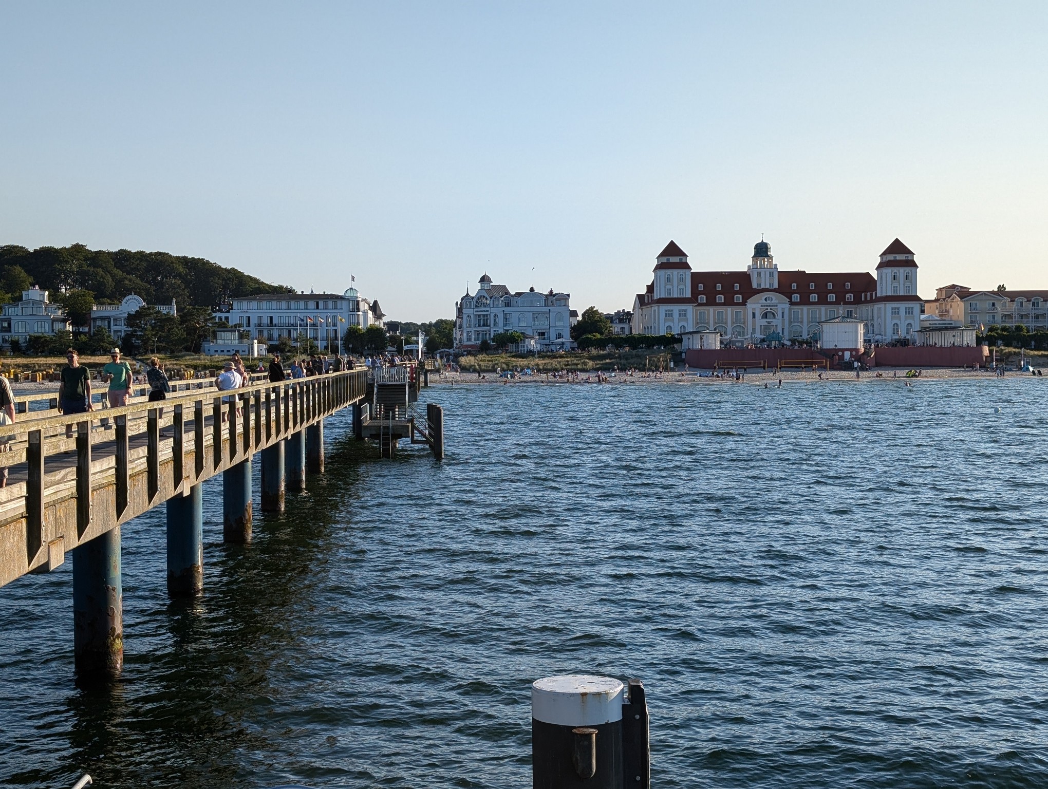 In den letzten Jahren waren wir immer eine Woche in Süddeutschland in den Bergen zum Wandern, denn wir lieben die Berge. Gleichzeitig wollte ich aber längst mal wieder in den Norden, denn mein Herz fühlt sich dort zuhause. Dieses Jahr war es endlich wieder soweit und wir konnten nicht nur eine Woche Berge, sondern auch eine Woche Norden einplanen. Unsere Wahl fiel auf Binz auf Rügen, vor allem, weil es eine ICE-Direktverbindung von Frankfurt aus gibt. Ende Juli stiegen wir morgens um 8:50 Uhr in Frankfurt in den ICE ein und um 17:20 Uhr in Binz wieder aus. Vom Bahnhof aus waren es nur ca. 20 Minuten Fußweg bis zum Hotel Am Meer & Spa, das direkt an der Strandpromenade liegt. Auch wenn wir die Zugfahrt genossen haben, wollten wir uns vor dem Abendessen noch etwas die Füße vertreten und liefen auf der Strandpromenade bis zur Seebrücke.