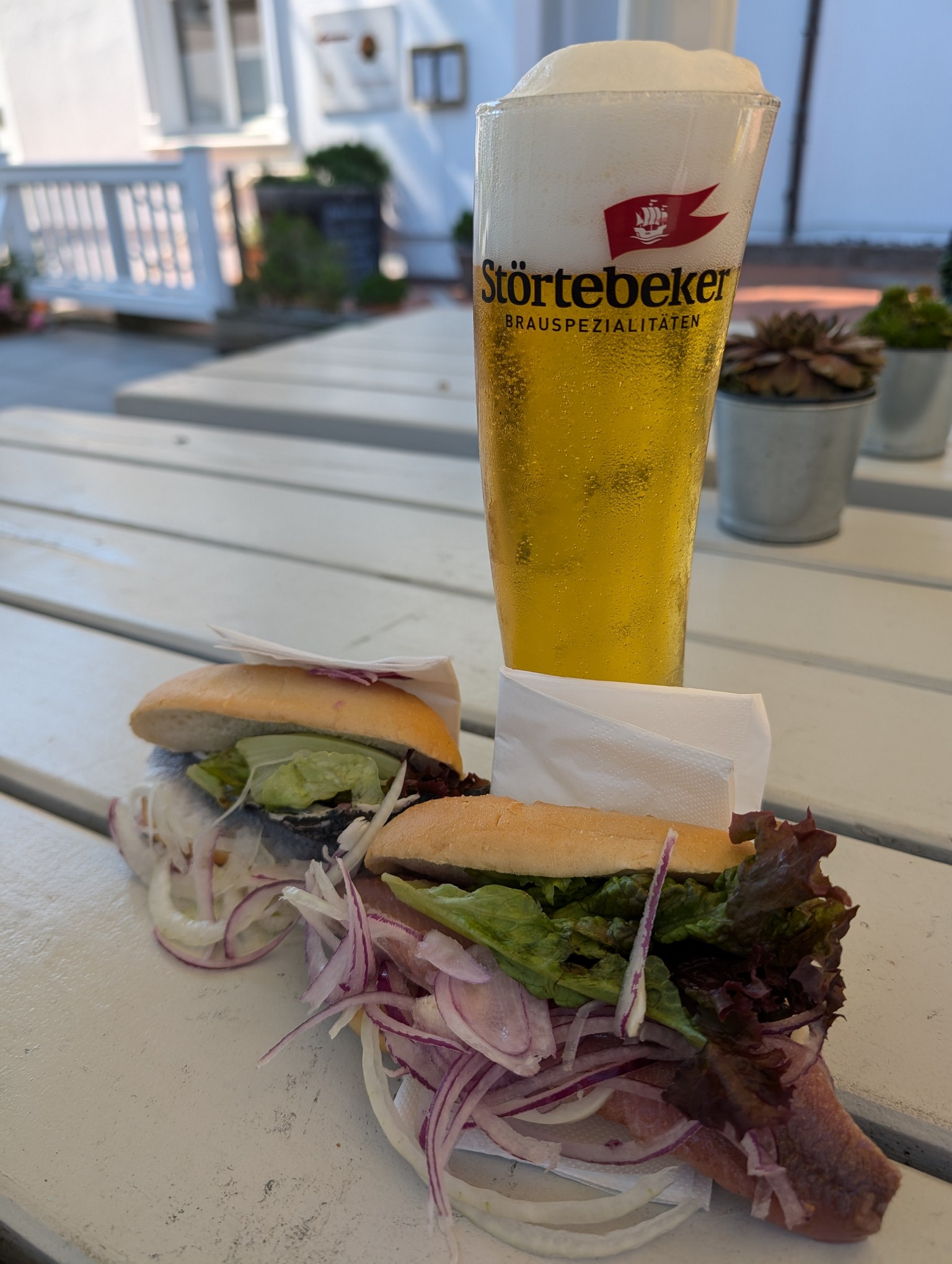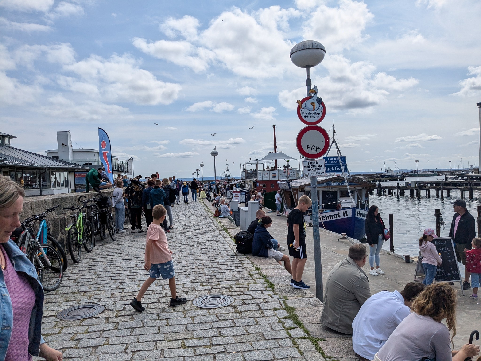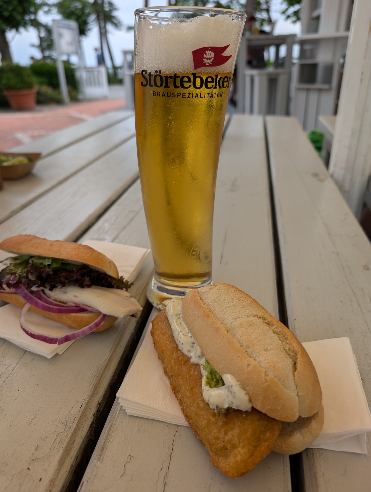 Zurück am Hafen hatten wir große Lust auf Fischbrötchen. Zwei kleine Kutter lagen hier, die direkt vom Kutter aus Fischbrötchen verkauften. Wir entschieden uns für den, der Sitzplätz auf dem Oberdeck hat und genossen sehr leckere, frisch gemachte Fischbrötchen.