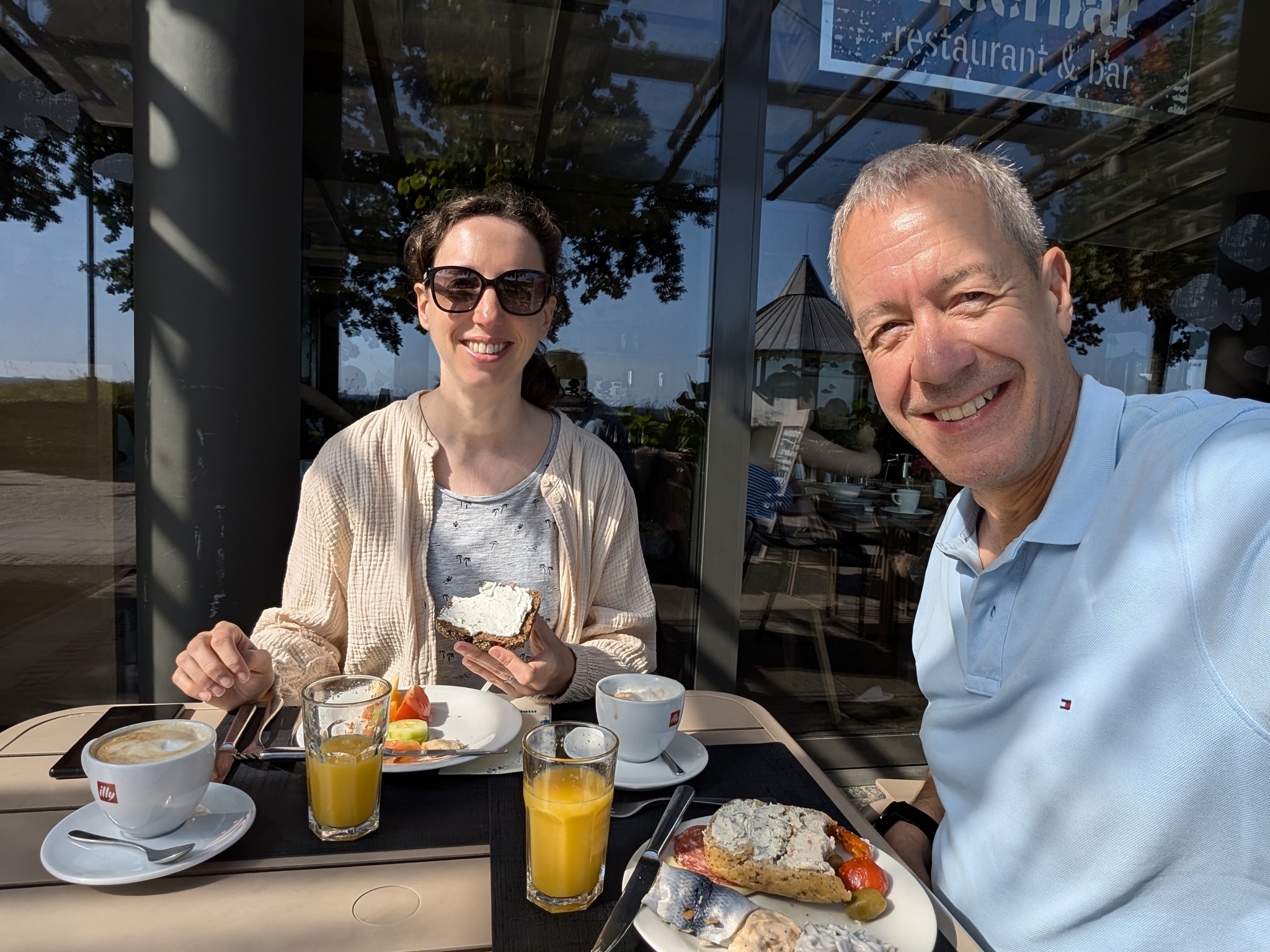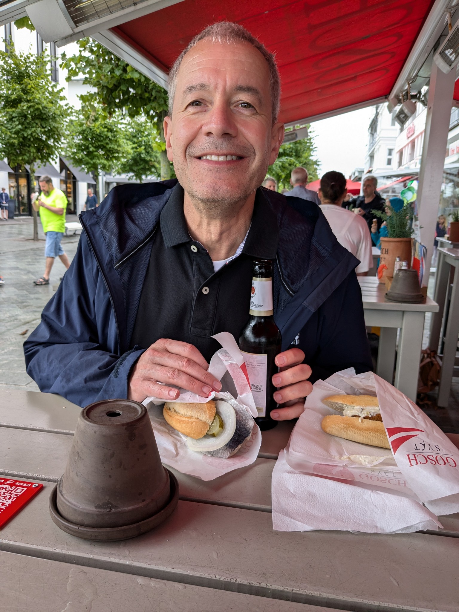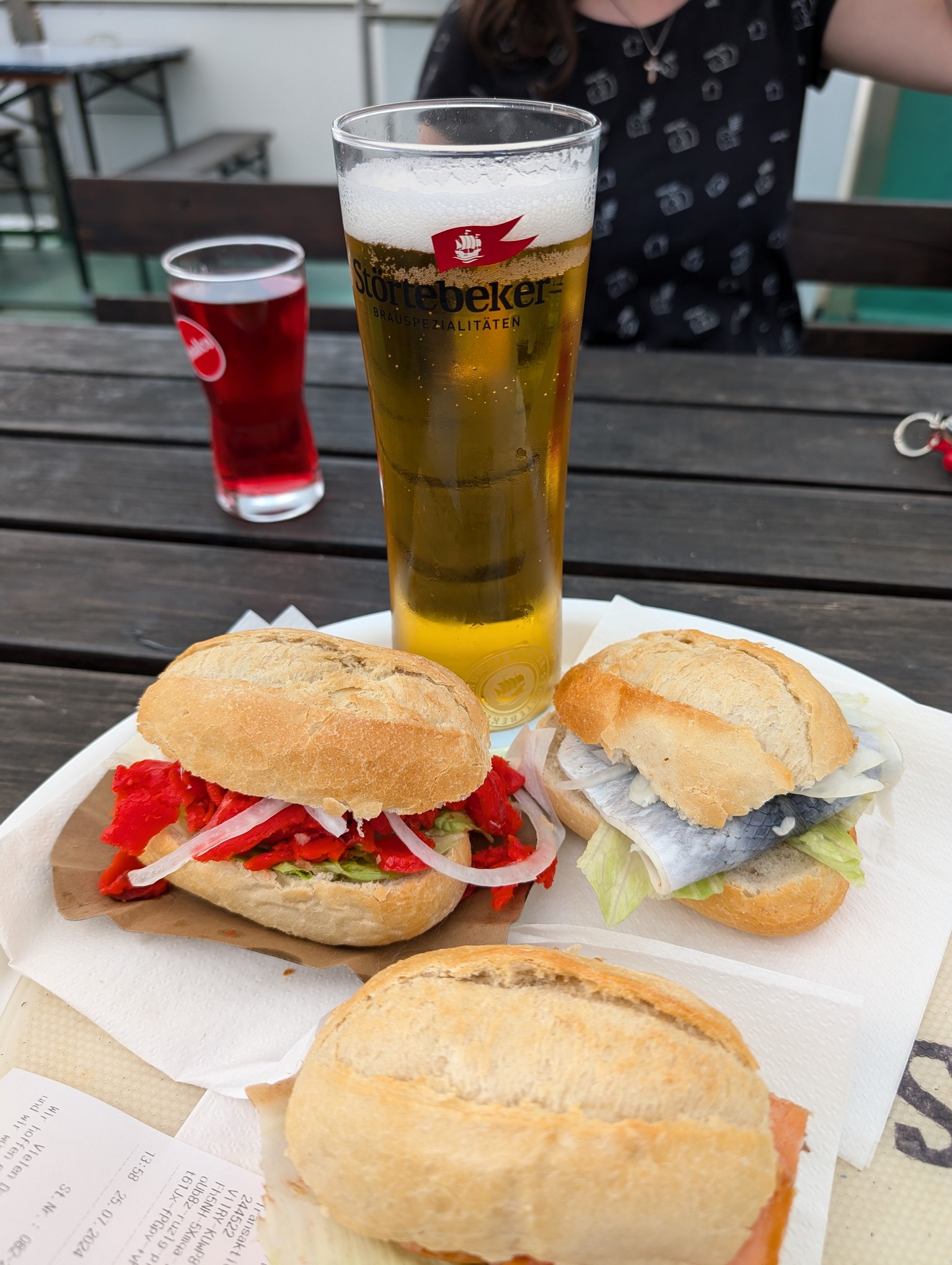 Zurück am Hafen hatten wir große Lust auf Fischbrötchen. Zwei kleine Kutter lagen hier, die direkt vom Kutter aus Fischbrötchen verkauften. Wir entschieden uns für den, der Sitzplätz auf dem Oberdeck hat und genossen sehr leckere, frisch gemachte Fischbrötchen.