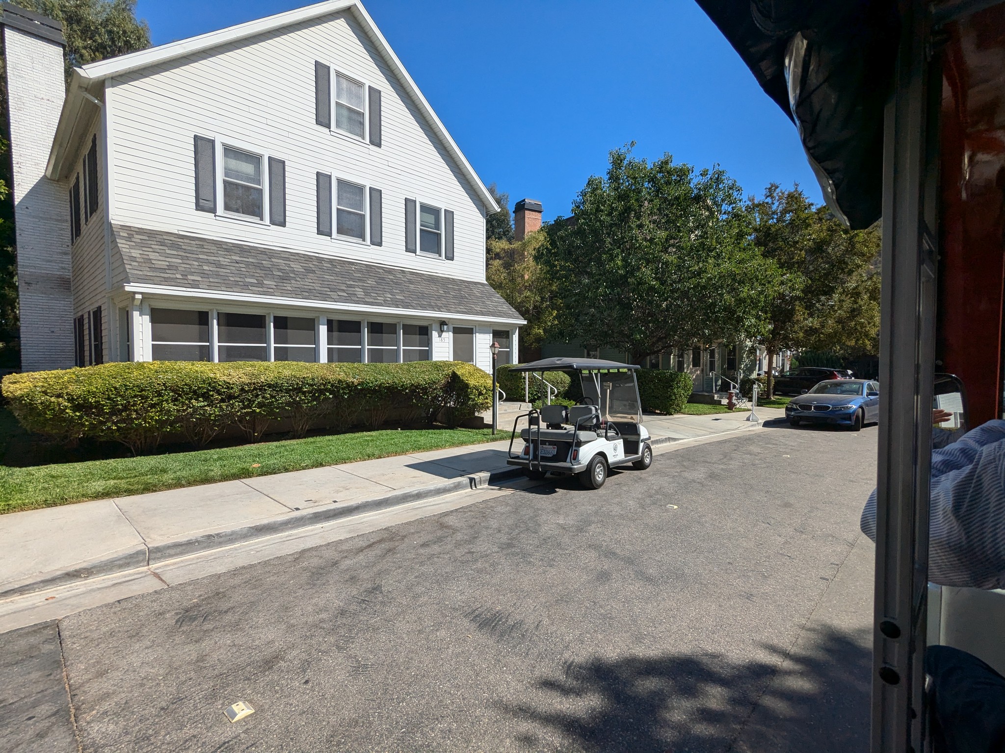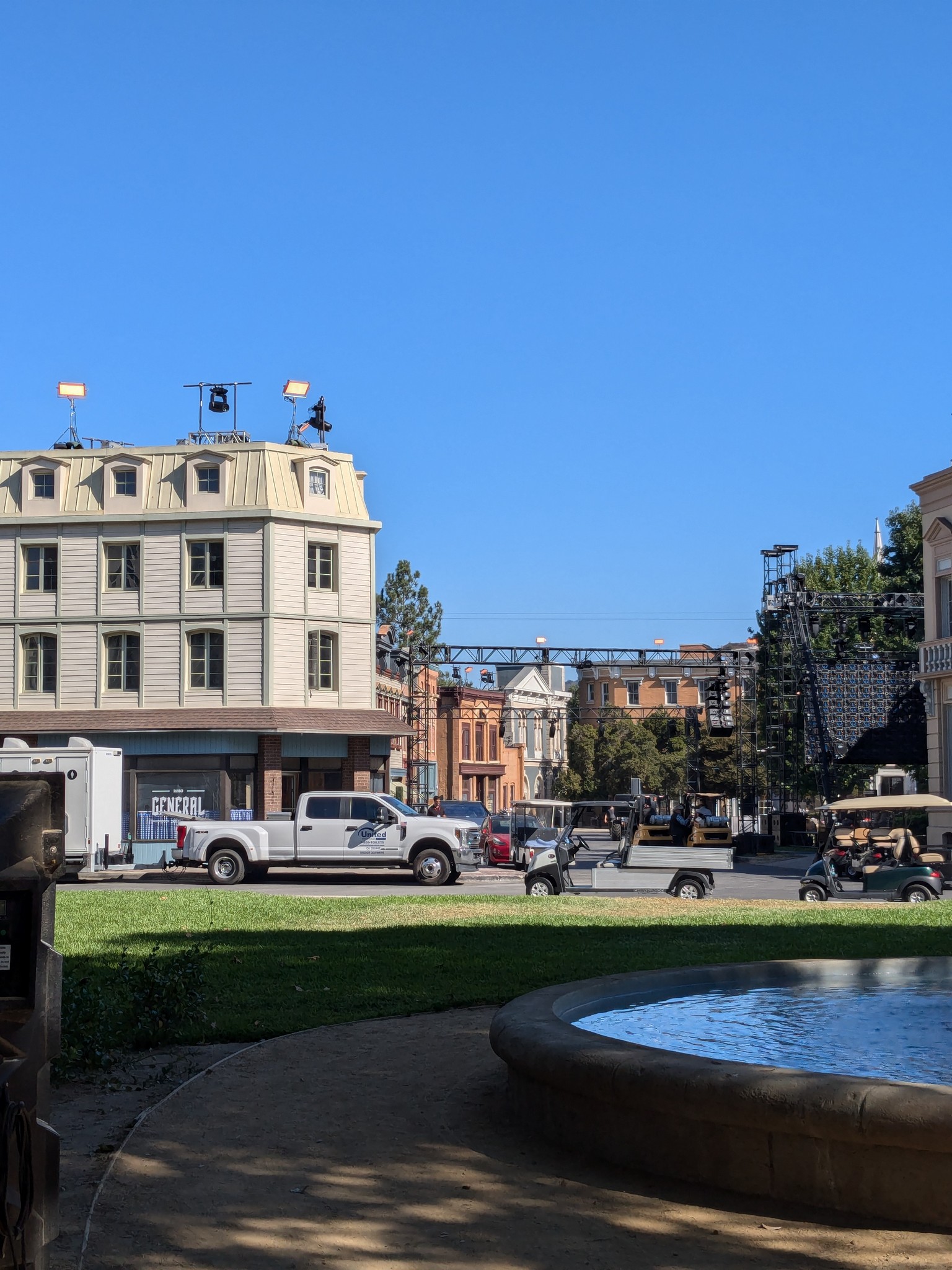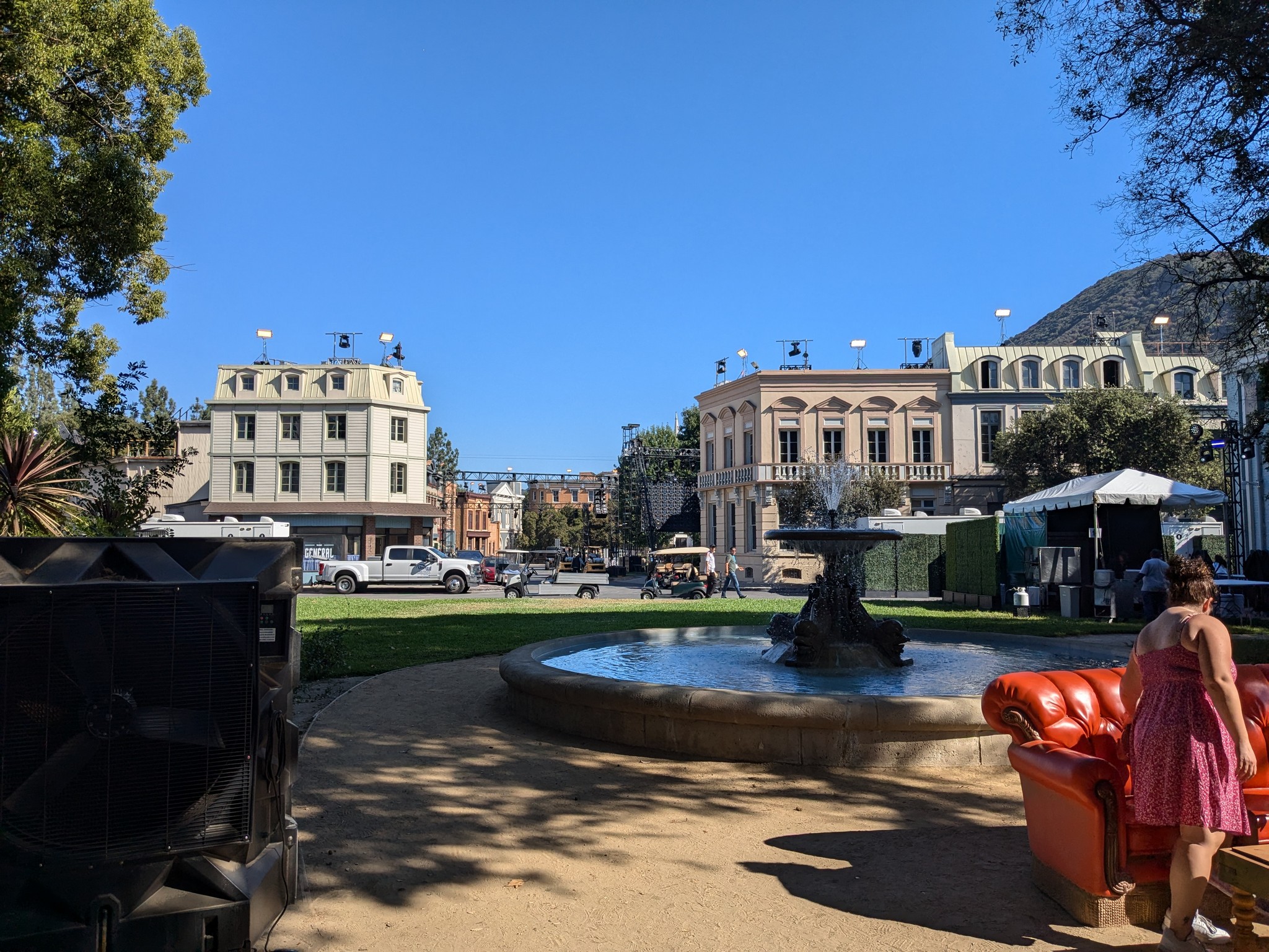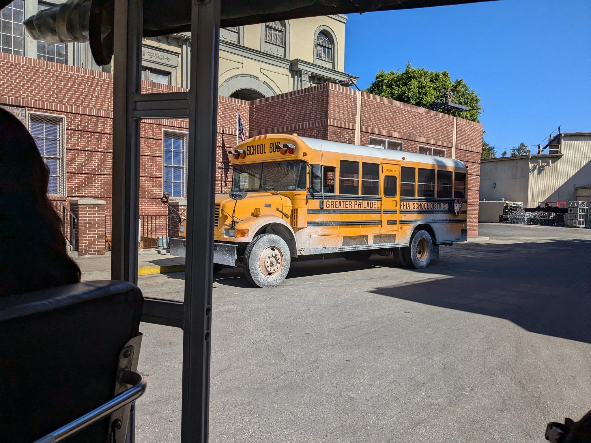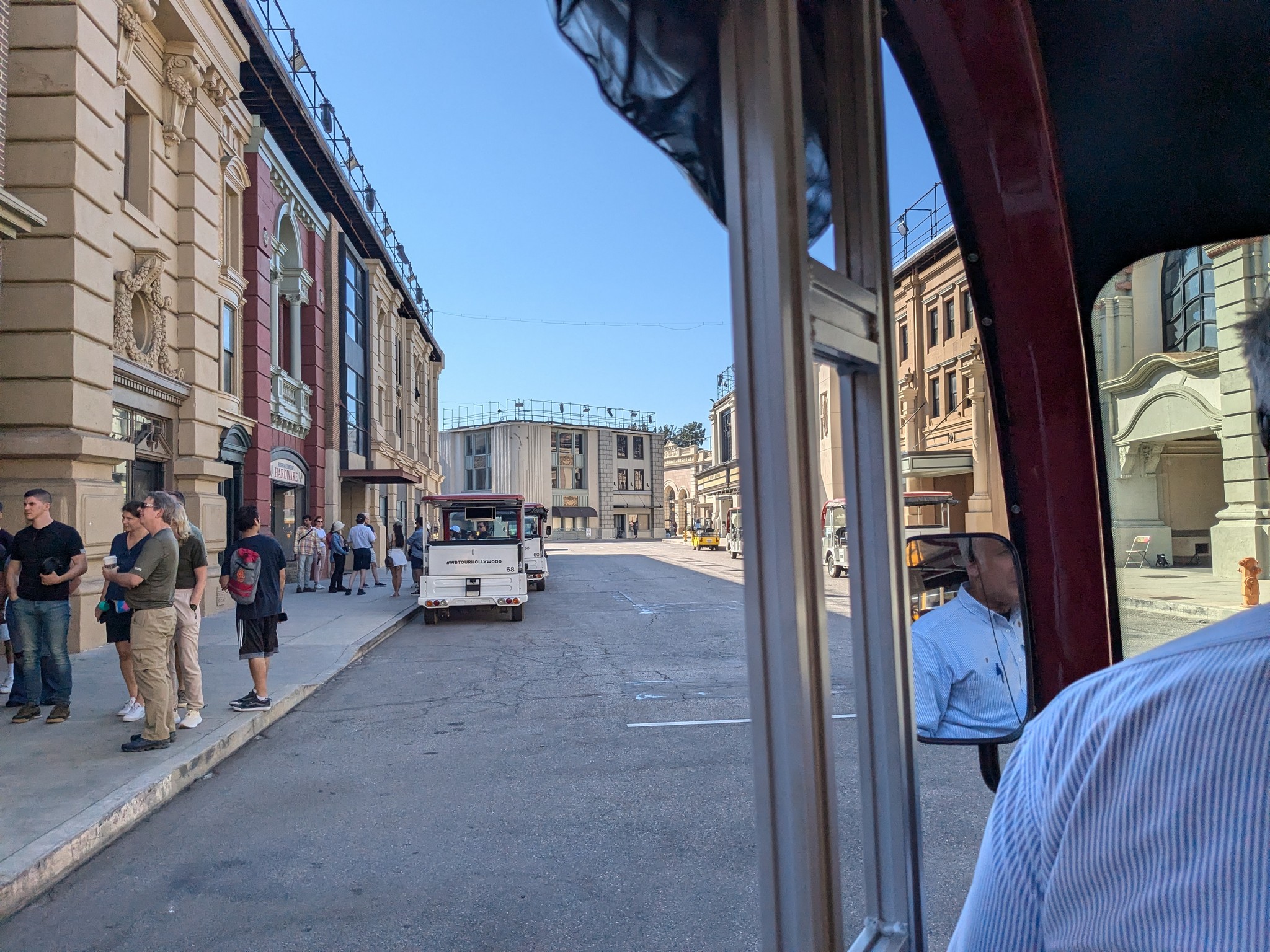 Auf einem Bildschirm im Cart zeigte er uns immer wieder Ausschnitte aus Filmen und Serien, in denen die jeweilige Kulisse vorkam. Eine Straße, die aussah wie ein typisch amerikanischer Vorort, besteht eigentlich aus Bürogebäuden. Aber anstatt einfache Bürogebäude zu bauen, hatte Warner Bros. diese als Häuser eines Vororts gestaltet, sodass sie als Kulisse dienen können, wenn gewünscht.