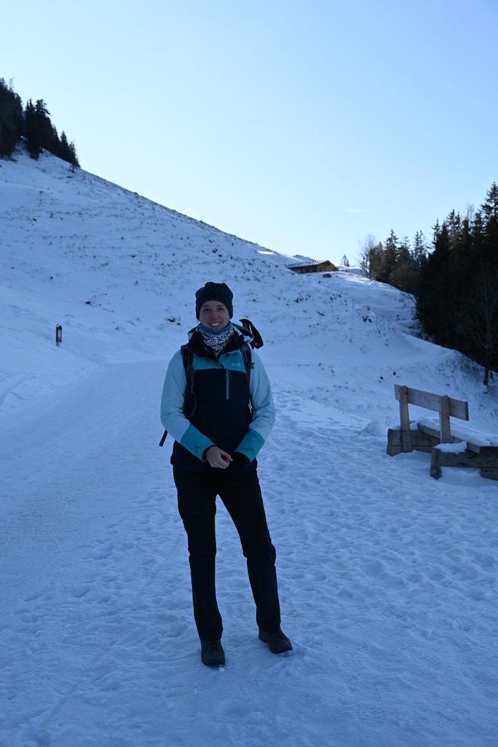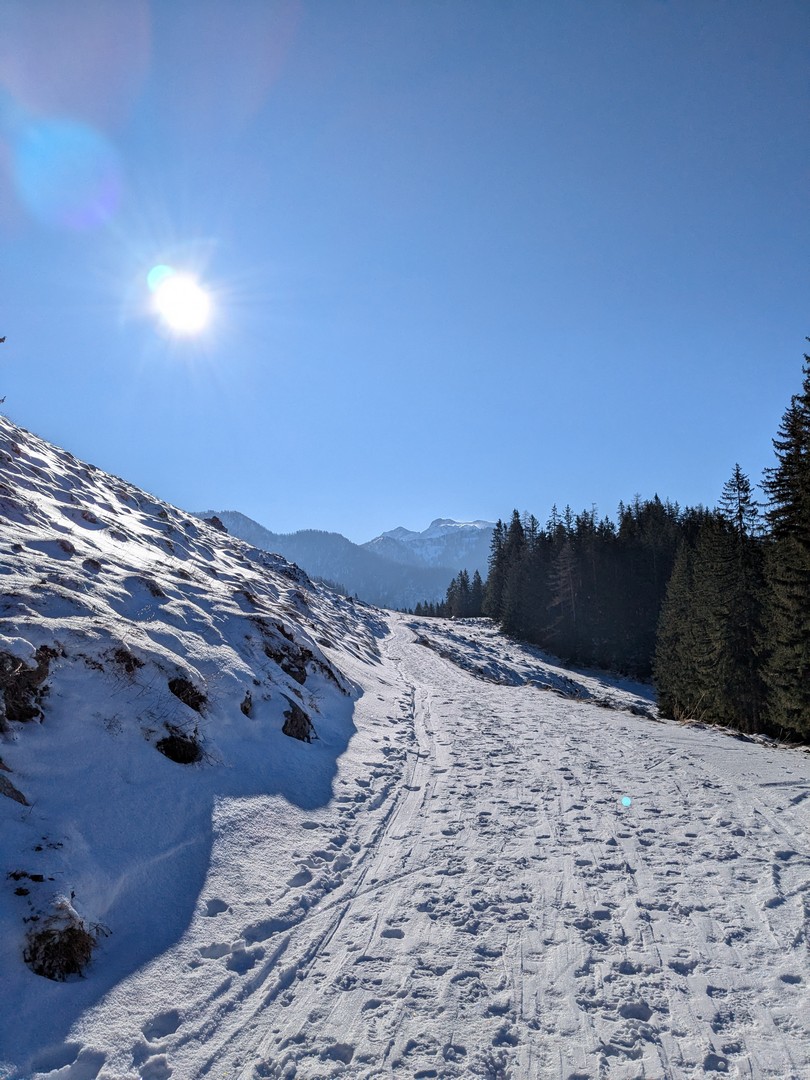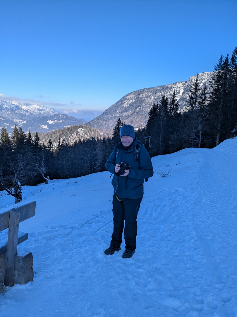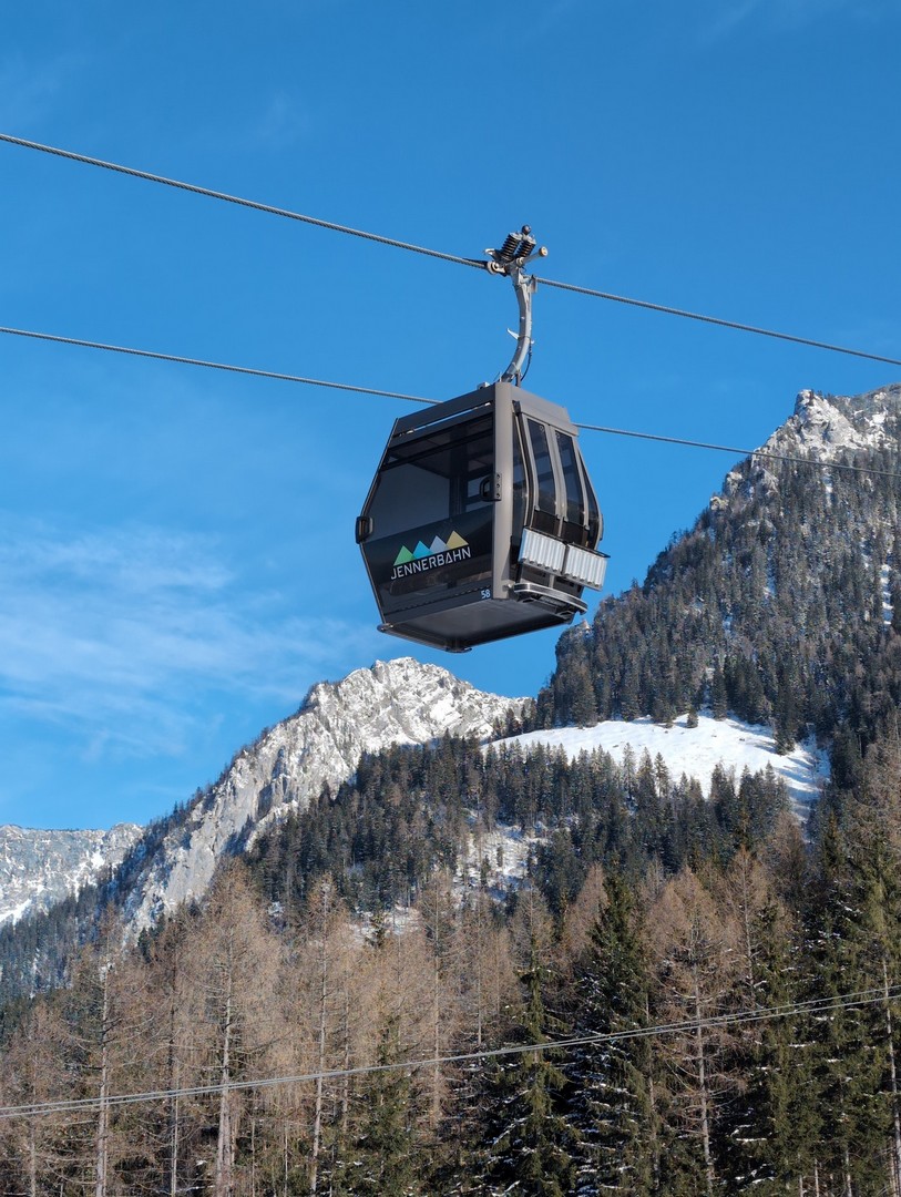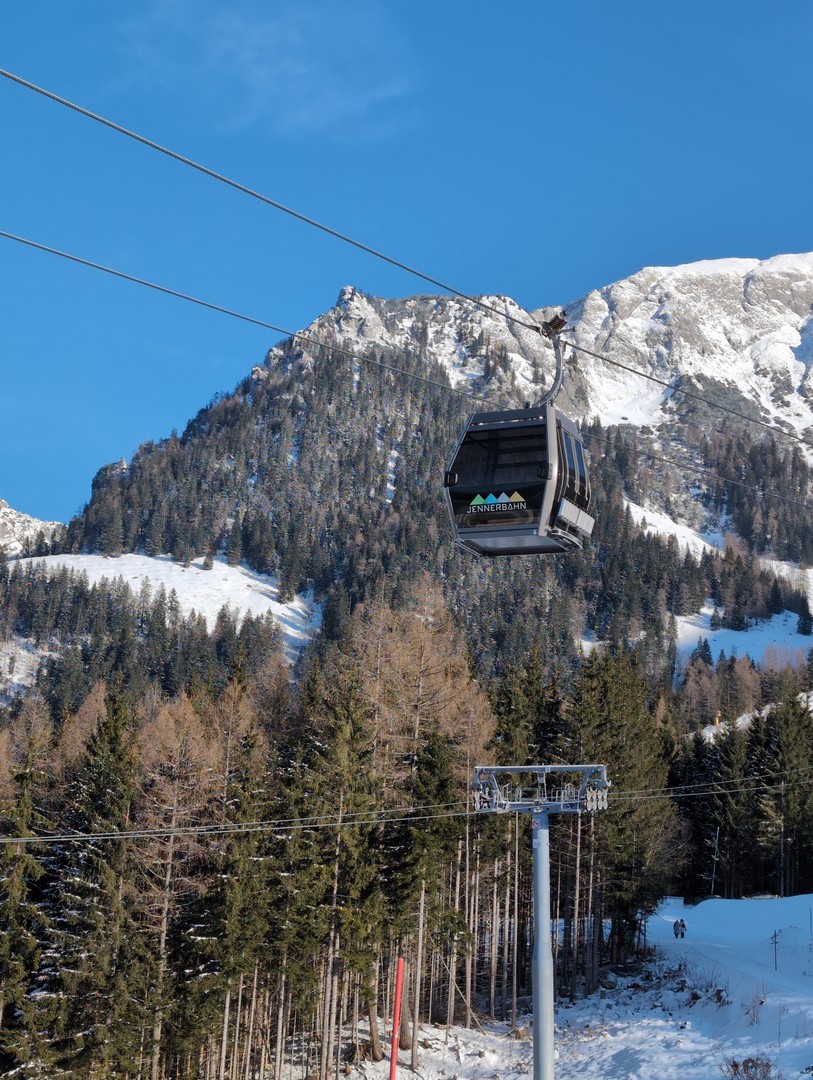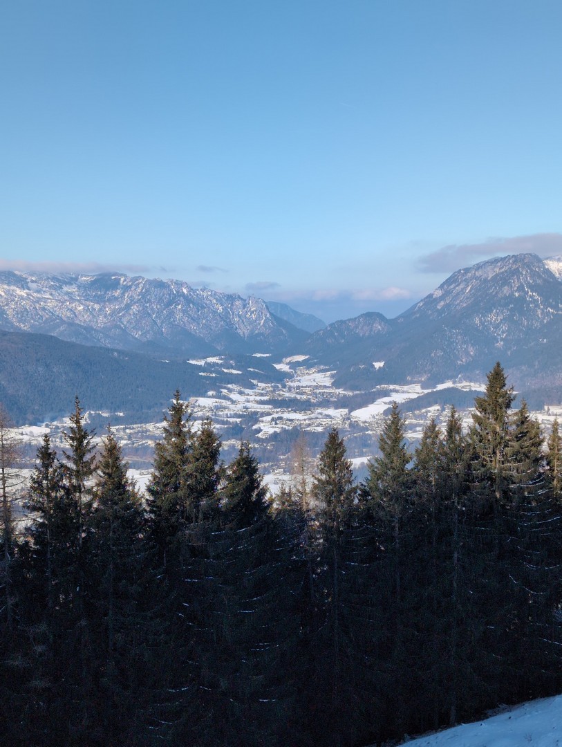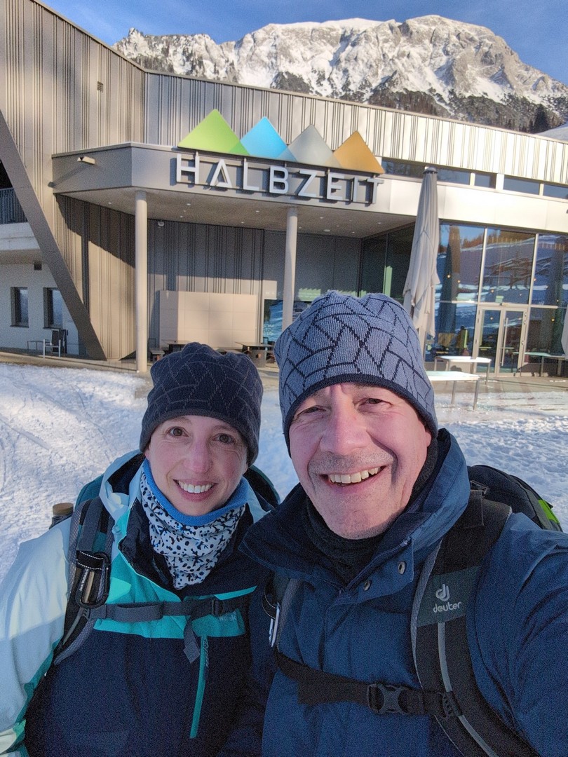 Die Wettervorhersage zeigte für Montag, unseren ersten Urlaubstag, strahlenden Sonnenschein und so fuhren wir mit der Jennerbahn zur Mittelstation des Jenner für eine Wanderung auf dem Königsweg. Die Wanderung hatten wir 2023 schon mal gemacht, damals bei sehr warmen Temperaturen mitten im Sommer. Diesmal war es ziemlich kalt und im ersten Moment haben wir uns gefragt, warum wir uns das angetan haben. Aber sobald wir warm gelaufen waren, konnten wir die Wanderung sehr genießen. Wir hatten mehrmals einen tollen Ausblick ins Tal. Insgesamt hat die Wanderung 7,5km und 320hm. Es fühlte sich durch den Schnee allerdings etwas anstrengender an. Am Ende genossen wir eine leckere Suppe im Restaurant Halbzeit in der Mittelstation der Jennerbahn.