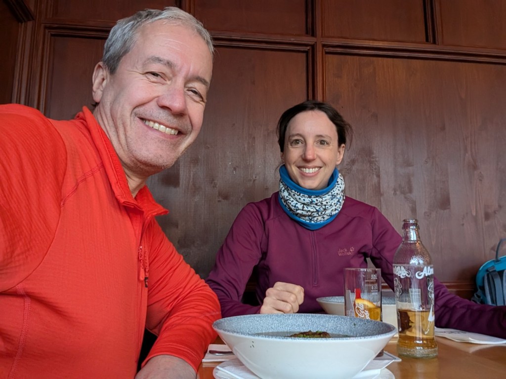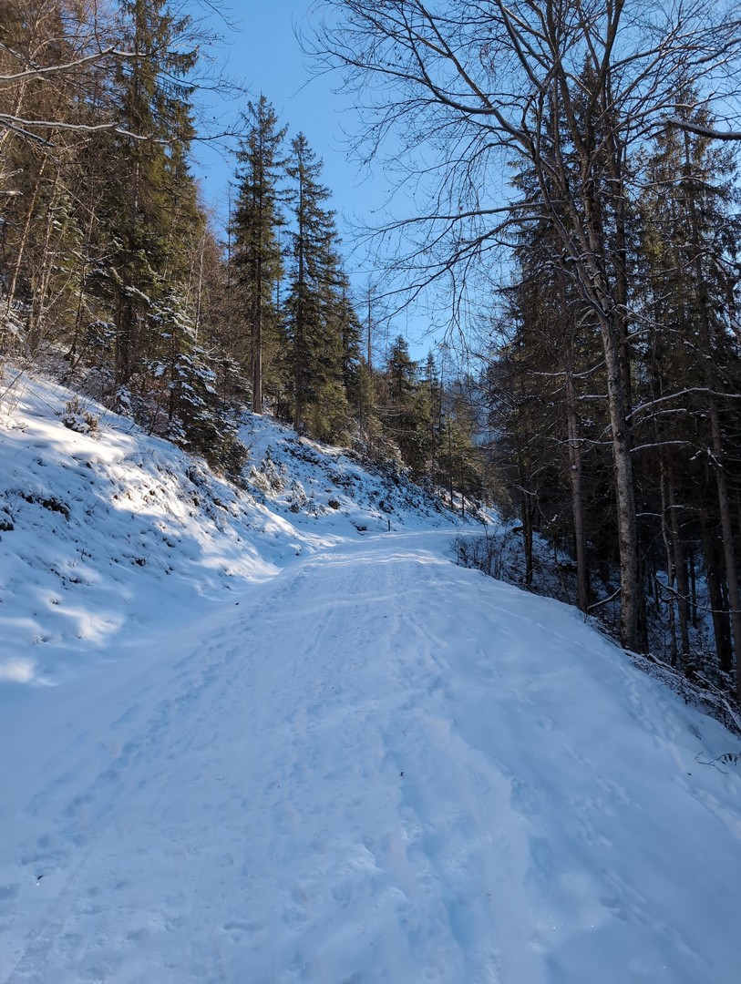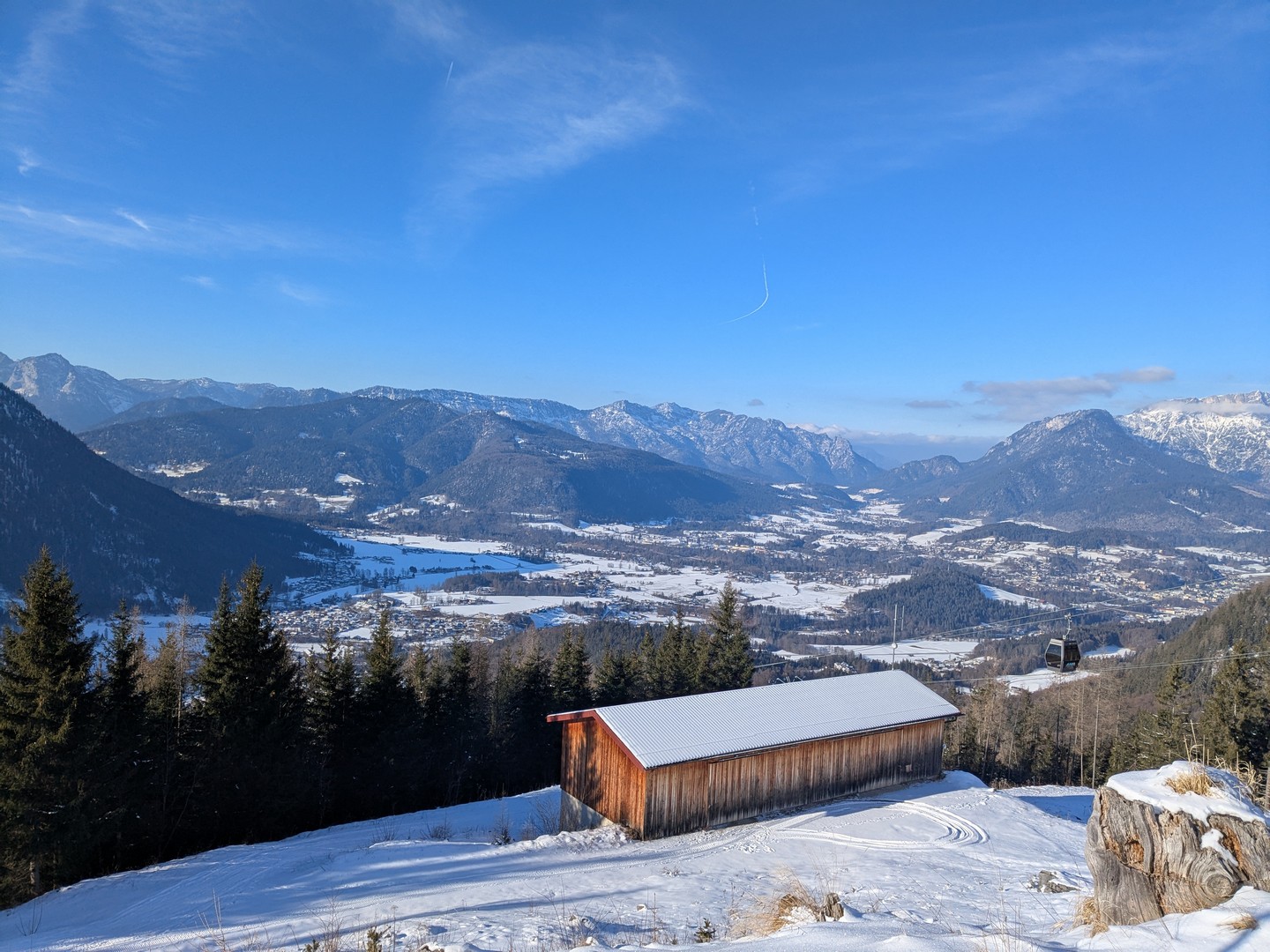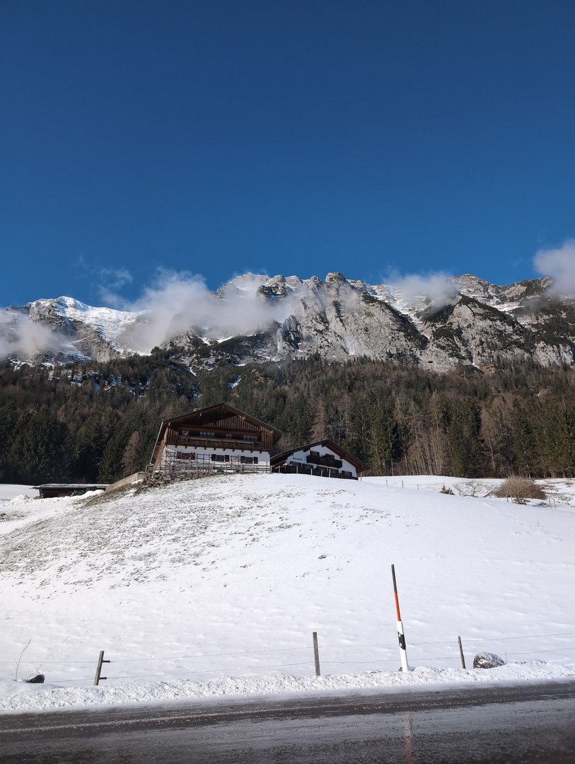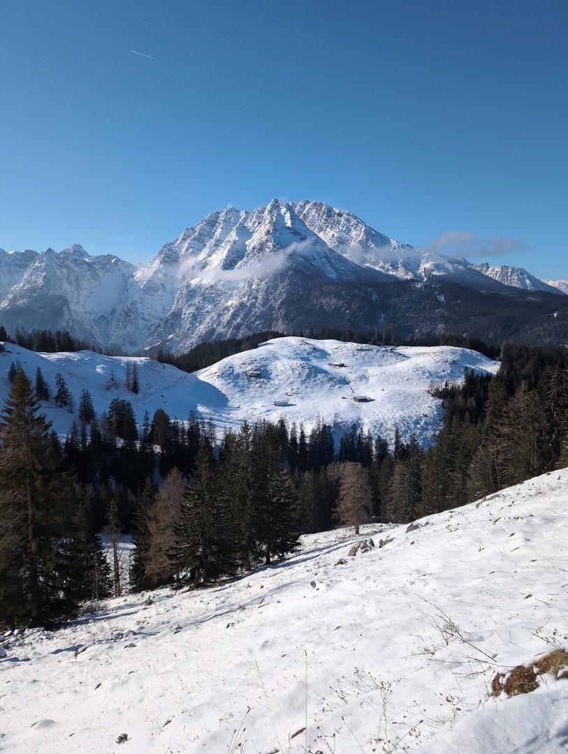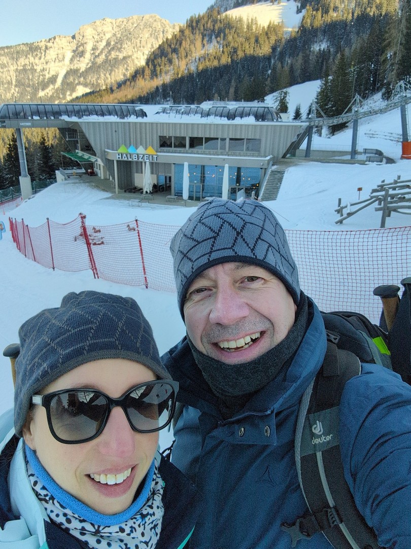 Die Wettervorhersage zeigte für Montag, unseren ersten Urlaubstag, strahlenden Sonnenschein und so fuhren wir mit der Jennerbahn zur Mittelstation des Jenner für eine Wanderung auf dem Königsweg. Die Wanderung hatten wir 2023 schon mal gemacht, damals bei sehr warmen Temperaturen mitten im Sommer. Diesmal war es ziemlich kalt und im ersten Moment haben wir uns gefragt, warum wir uns das angetan haben. Aber sobald wir warm gelaufen waren, konnten wir die Wanderung sehr genießen. Wir hatten mehrmals einen tollen Ausblick ins Tal. Insgesamt hat die Wanderung 7,5km und 320hm. Es fühlte sich durch den Schnee allerdings etwas anstrengender an. Am Ende genossen wir eine leckere Suppe im Restaurant Halbzeit in der Mittelstation der Jennerbahn.