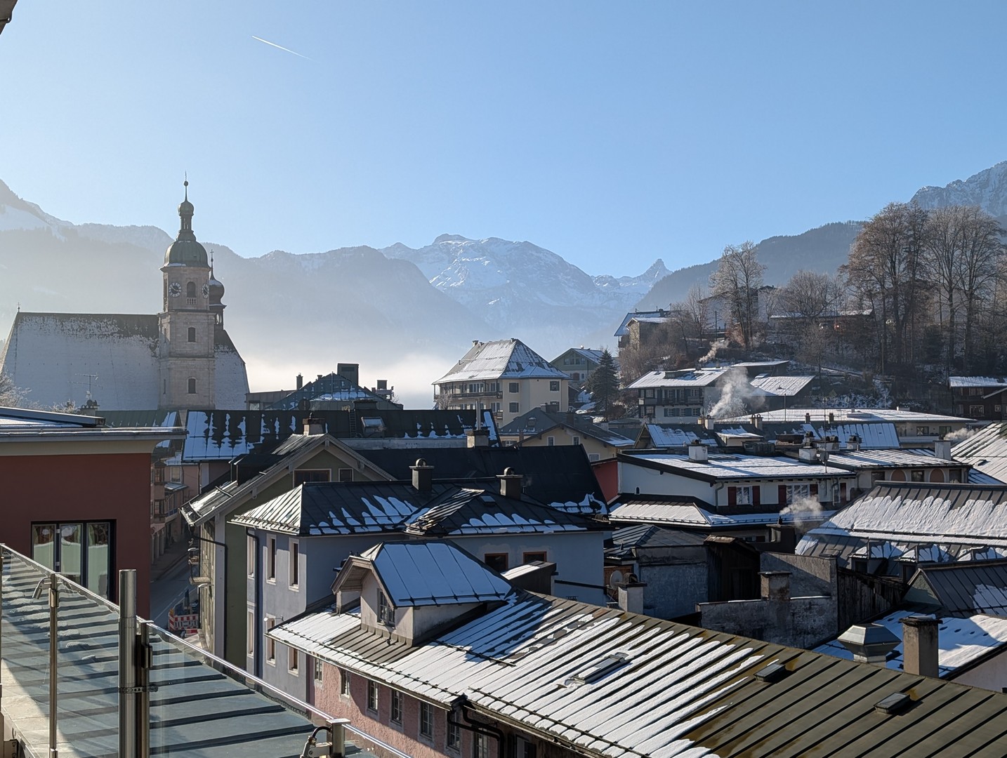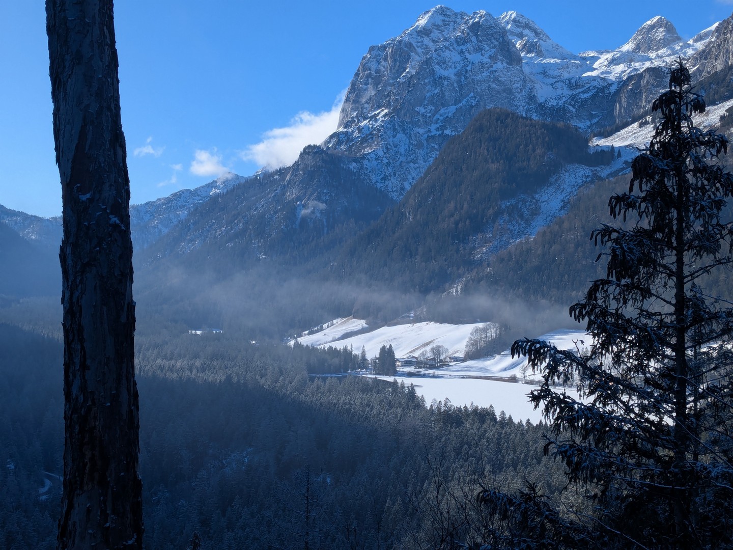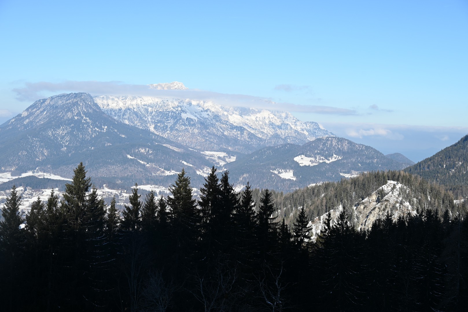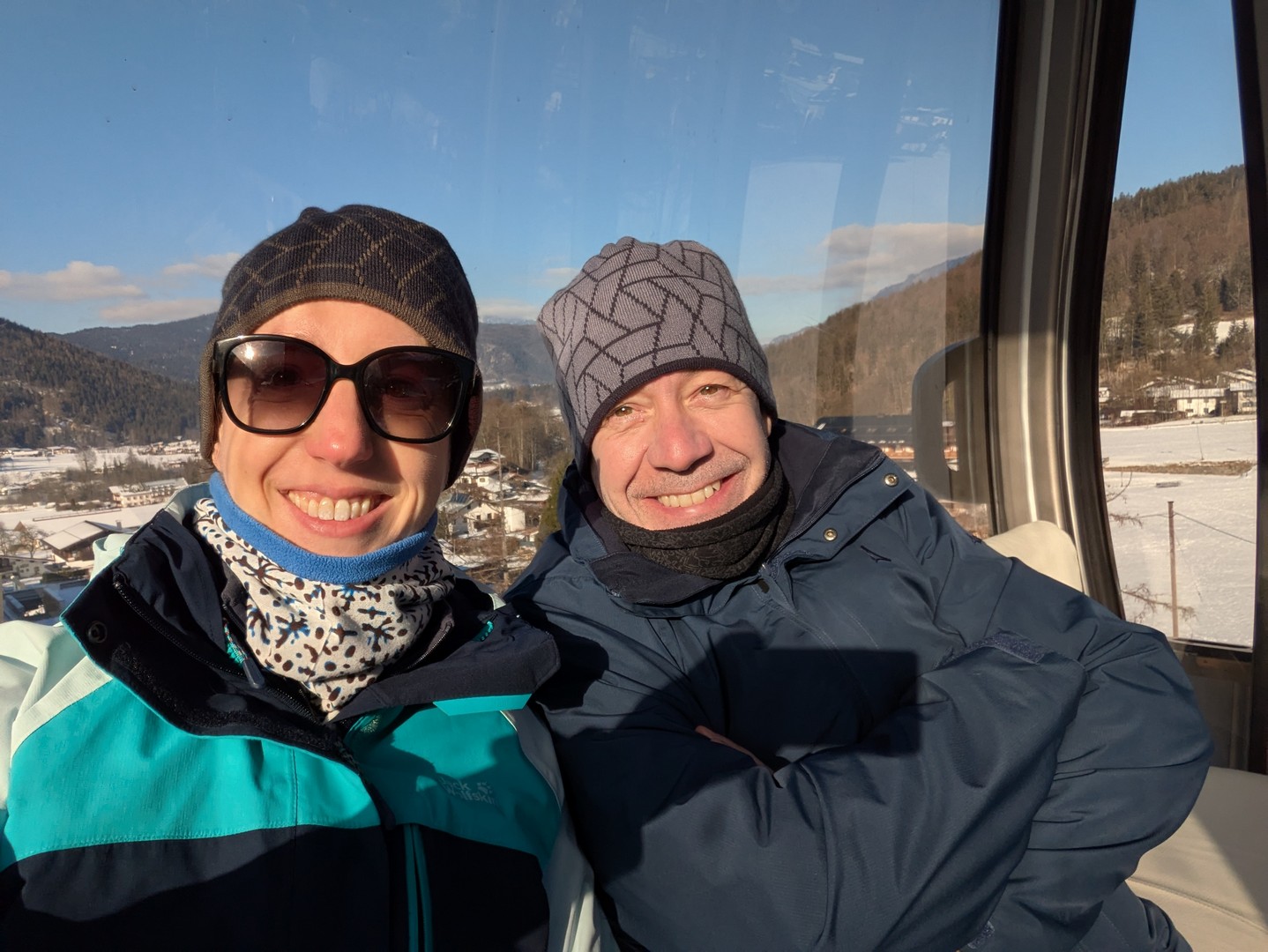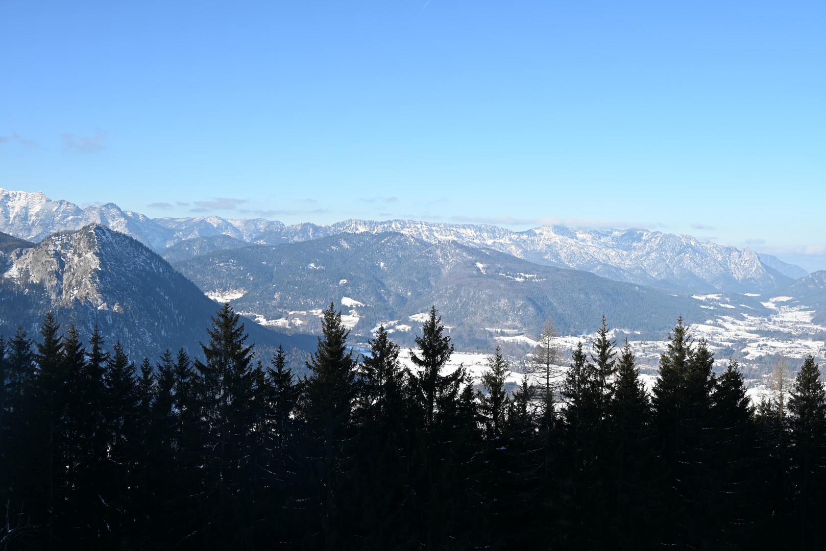Die Wettervorhersage zeigte für Montag, unseren ersten Urlaubstag, strahlenden Sonnenschein und so fuhren wir mit der Jennerbahn zur Mittelstation des Jenner für eine Wanderung auf dem Königsweg. Die Wanderung hatten wir 2023 schon mal gemacht, damals bei sehr warmen Temperaturen mitten im Sommer. Diesmal war es ziemlich kalt und im ersten Moment haben wir uns gefragt, warum wir uns das angetan haben. Aber sobald wir warm gelaufen waren, konnten wir die Wanderung sehr genießen. Wir hatten mehrmals einen tollen Ausblick ins Tal. Insgesamt hat die Wanderung 7,5km und 320hm. Es fühlte sich durch den Schnee allerdings etwas anstrengender an. Am Ende genossen wir eine leckere Suppe im Restaurant Halbzeit in der Mittelstation der Jennerbahn.