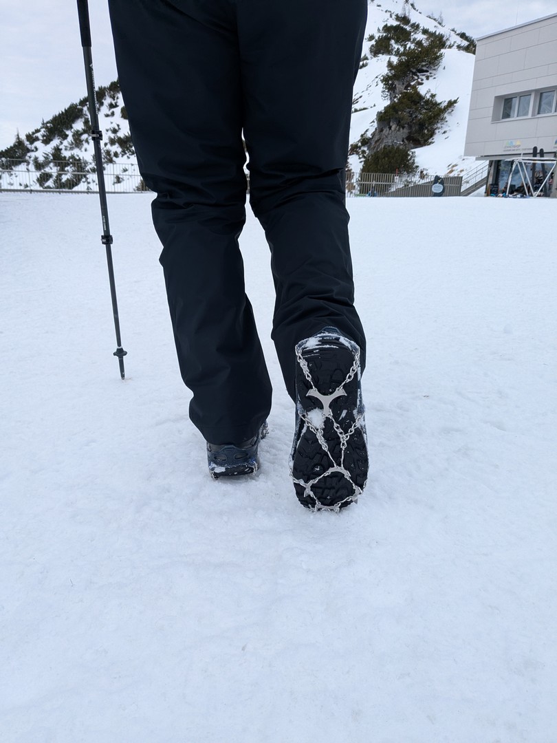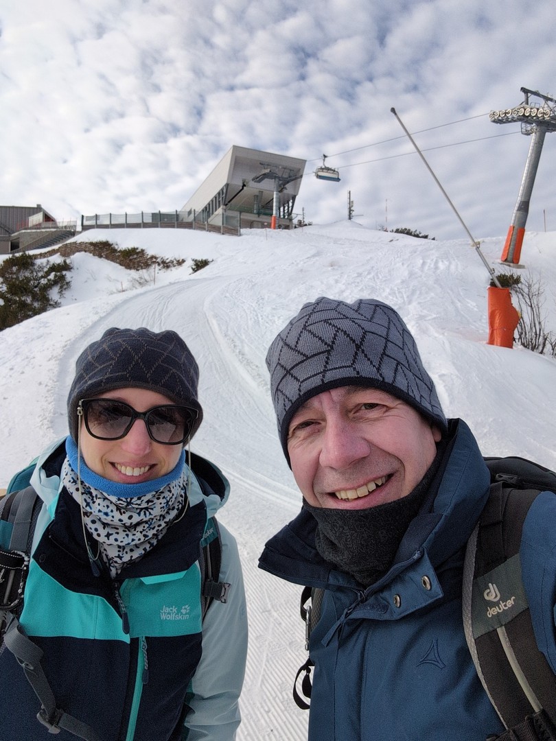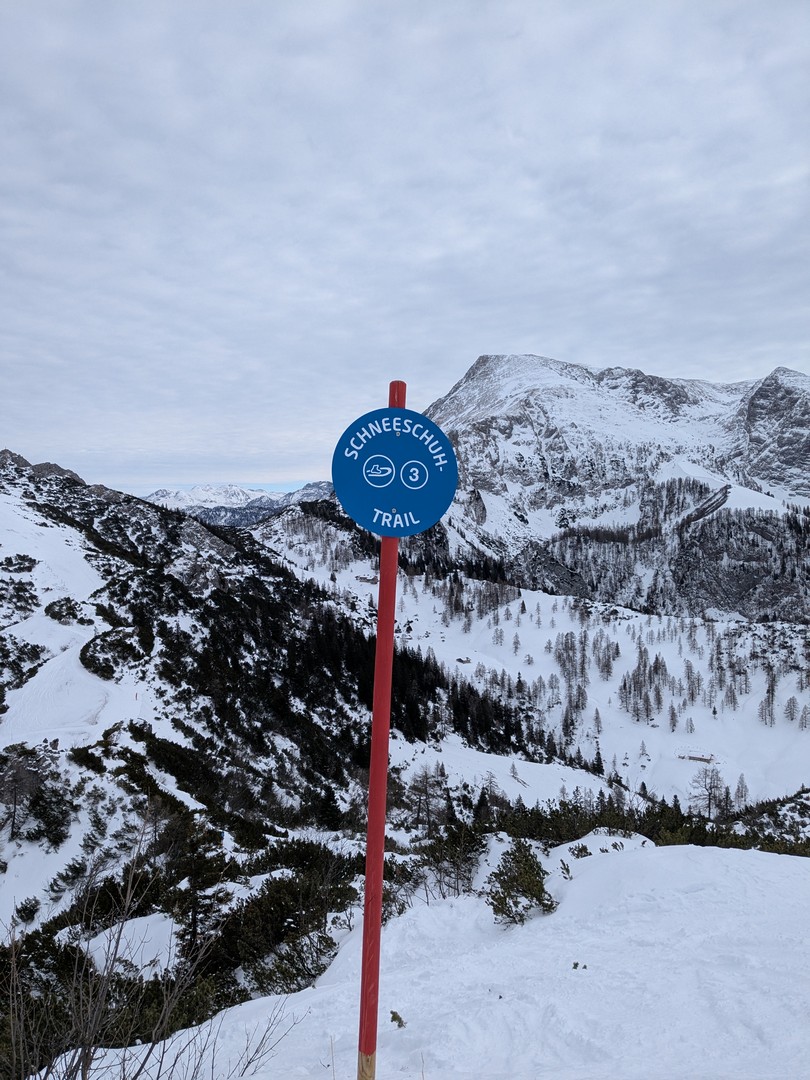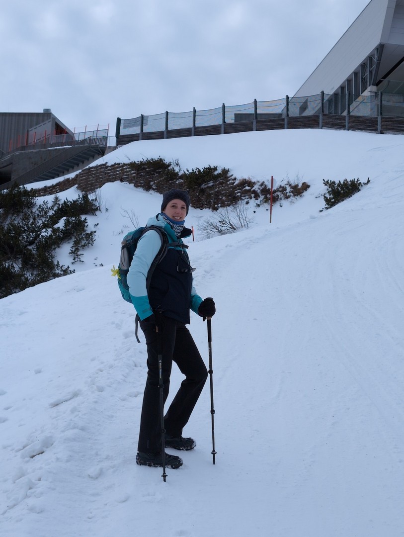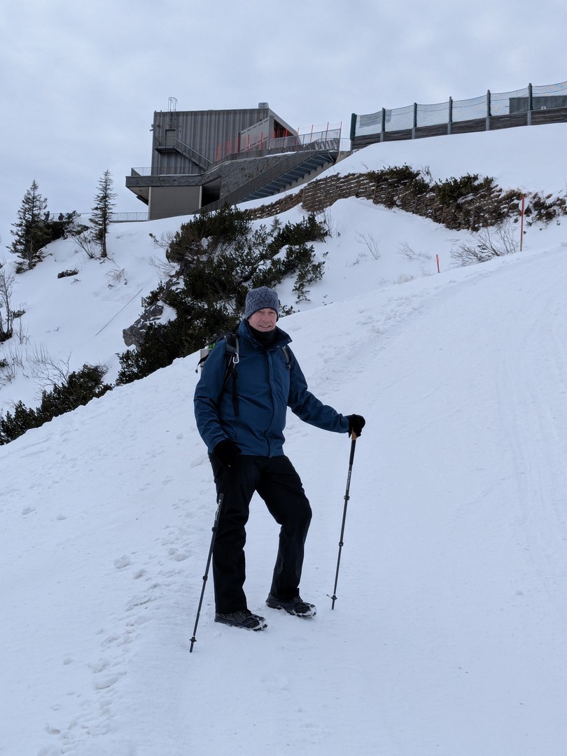 Da es am Mittwoch schneien sollte, entschlossen wir uns am Dienstag eine weitere Wanderung zu unternehmen. So fuhren wir diesmal mit der Jennerbahn bis zum Gipfel. Klaus hatte von hieraus eine Wanderung für uns geplant, allerdings stellte sich heraus, dass der Weg nicht begehbar war, da er als Rodelbahn genutzt wurde und für Fußgänger nicht erlaubt war. Also folgten wir den Schildern für den Schneeschuhtrail. Da wir keine Schneeschuhe hatten, nutzen wir zum ersten Mal unsere Spikes.