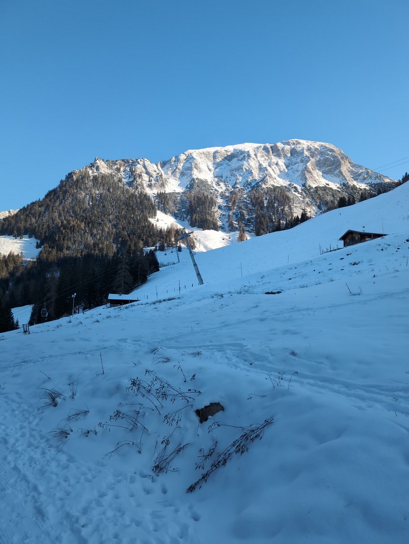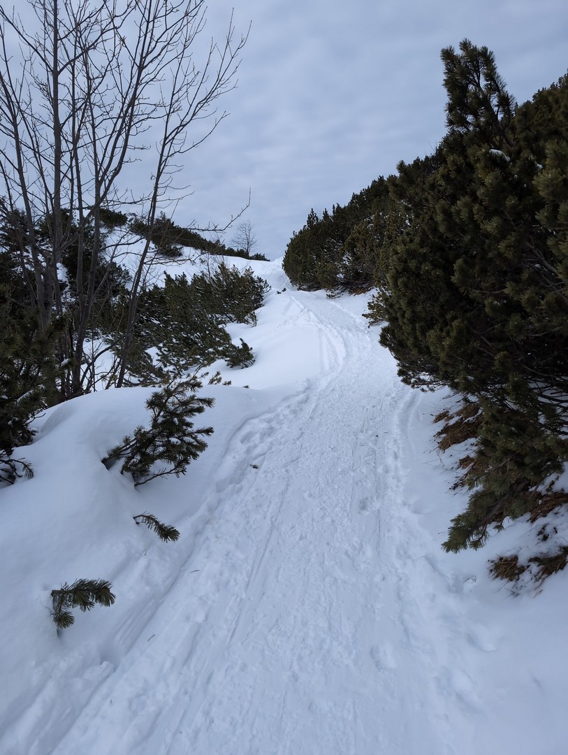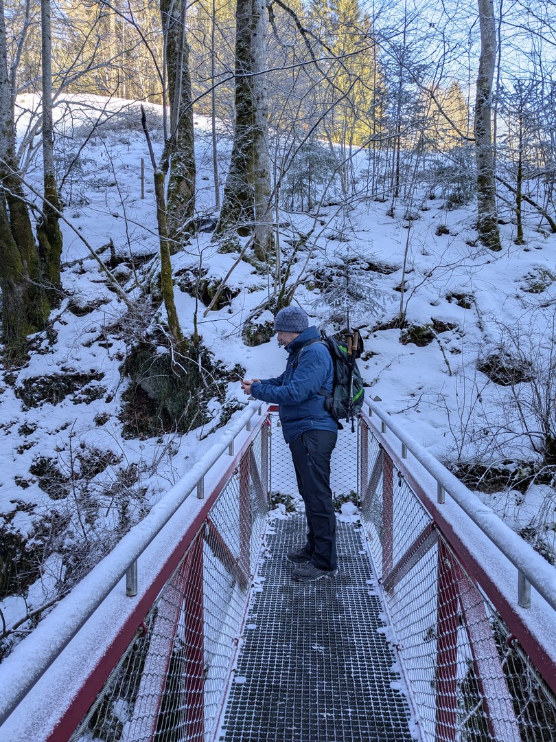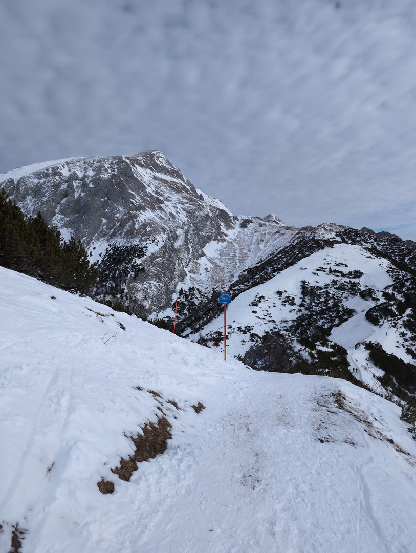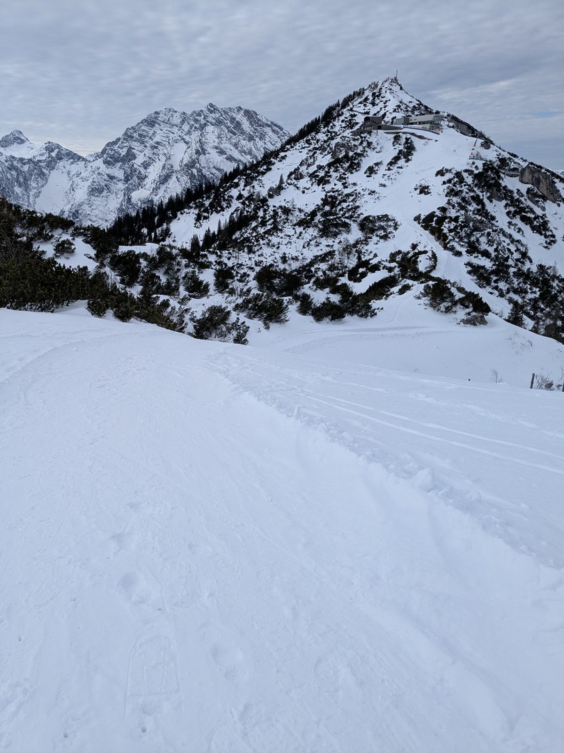 Da es am Mittwoch schneien sollte, entschlossen wir uns am Dienstag eine weitere Wanderung zu unternehmen. So fuhren wir diesmal mit der Jennerbahn bis zum Gipfel. Klaus hatte von hieraus eine Wanderung für uns geplant, allerdings stellte sich heraus, dass der Weg nicht begehbar war, da er als Rodelbahn genutzt wurde und für Fußgänger nicht erlaubt war. Also folgten wir den Schildern für den Schneeschuhtrail. Da wir keine Schneeschuhe hatten, nutzen wir zum ersten Mal unsere Spikes.