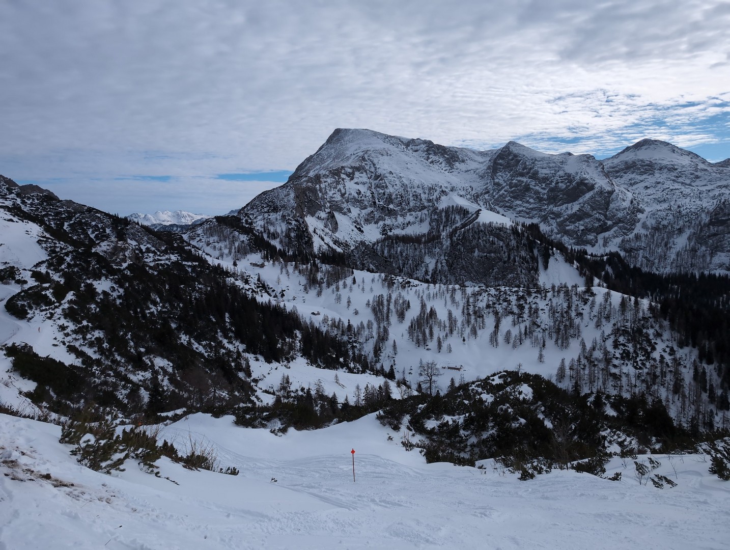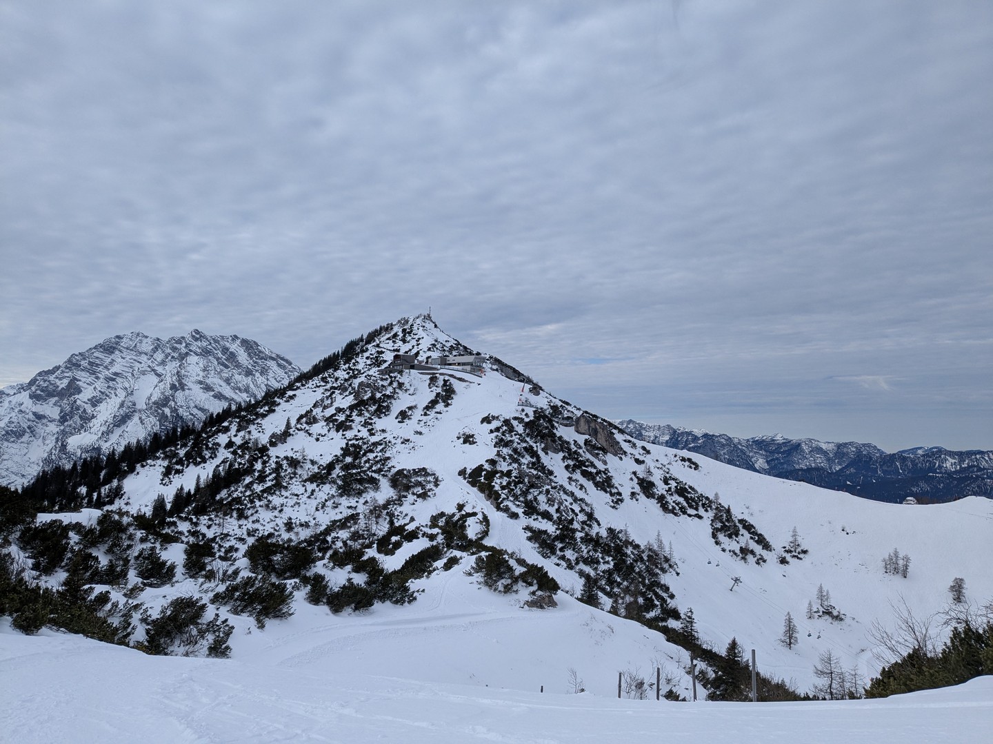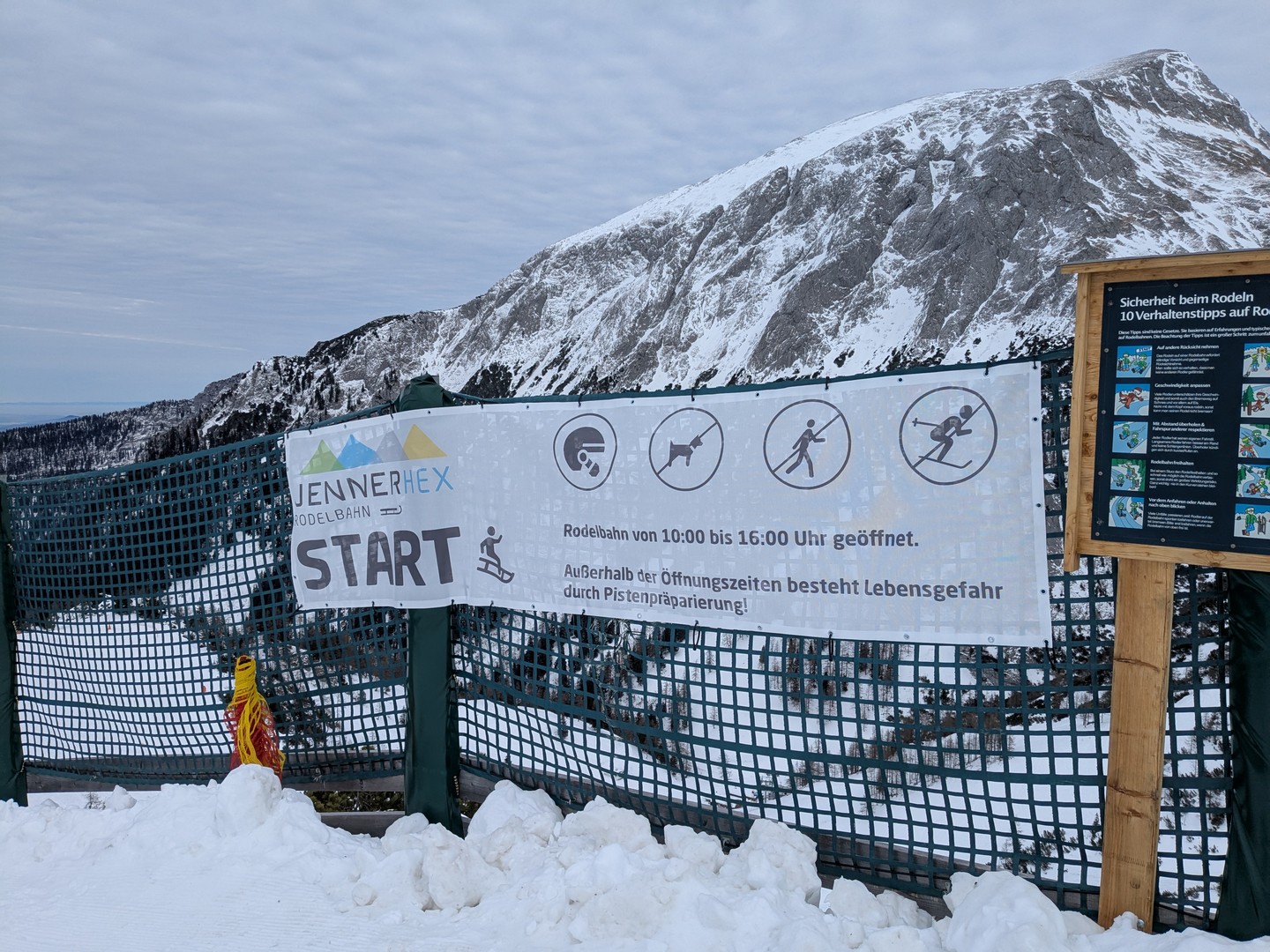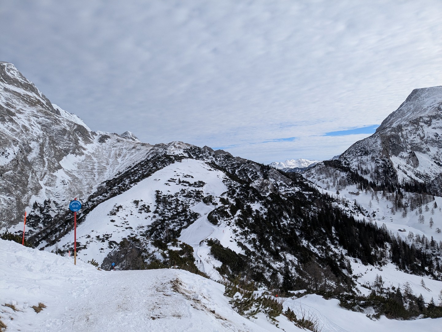 Da es am Mittwoch schneien sollte, entschlossen wir uns am Dienstag eine weitere Wanderung zu unternehmen. So fuhren wir diesmal mit der Jennerbahn bis zum Gipfel. Klaus hatte von hieraus eine Wanderung für uns geplant, allerdings stellte sich heraus, dass der Weg nicht begehbar war, da er als Rodelbahn genutzt wurde und für Fußgänger nicht erlaubt war. Also folgten wir den Schildern für den Schneeschuhtrail. Da wir keine Schneeschuhe hatten, nutzen wir zum ersten Mal unsere Spikes.
