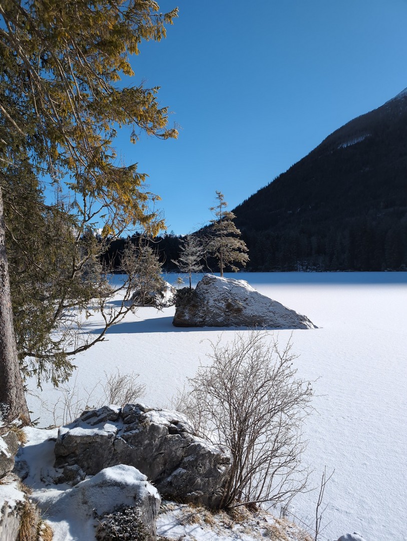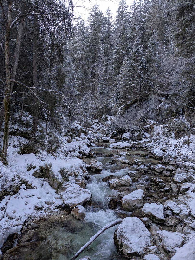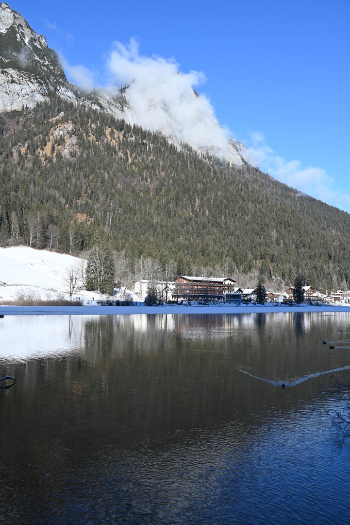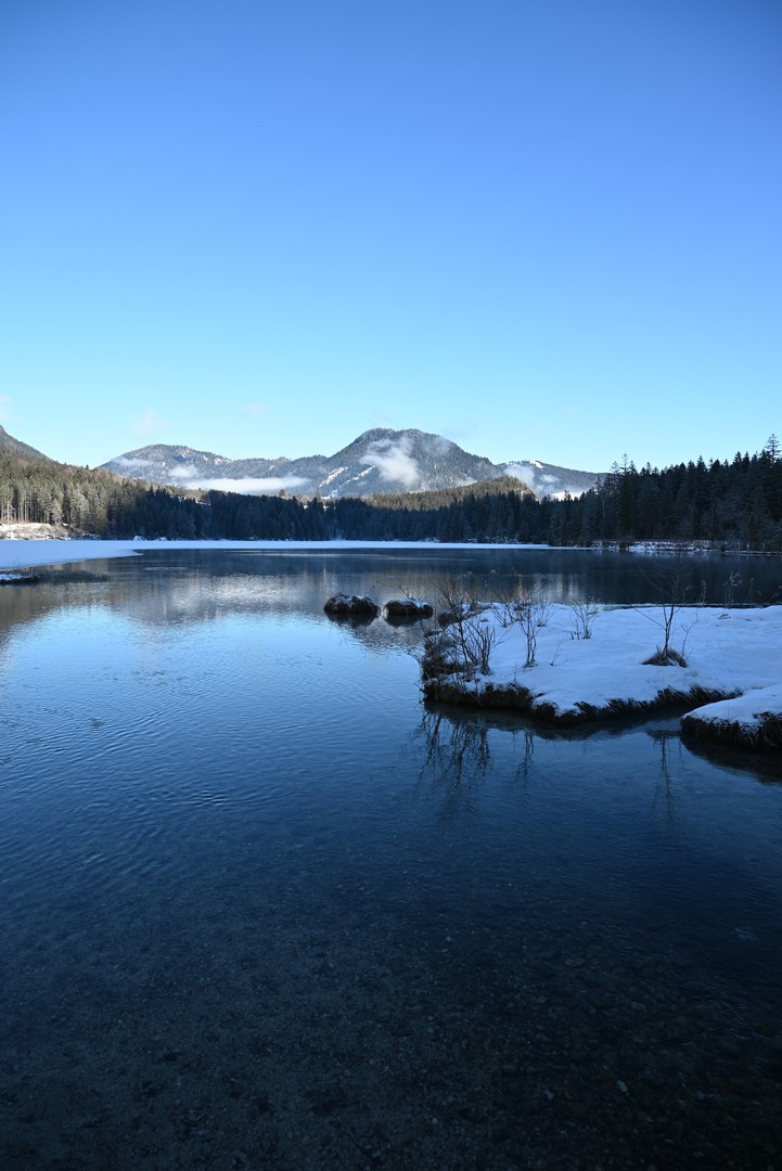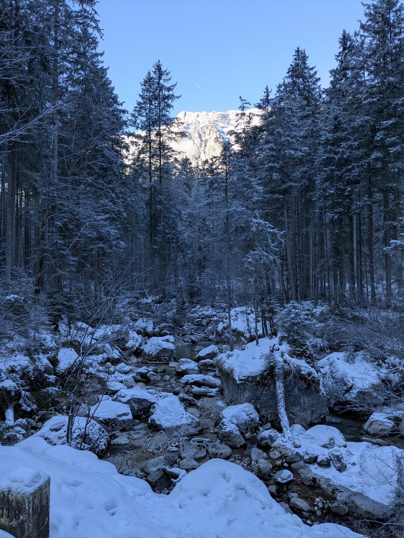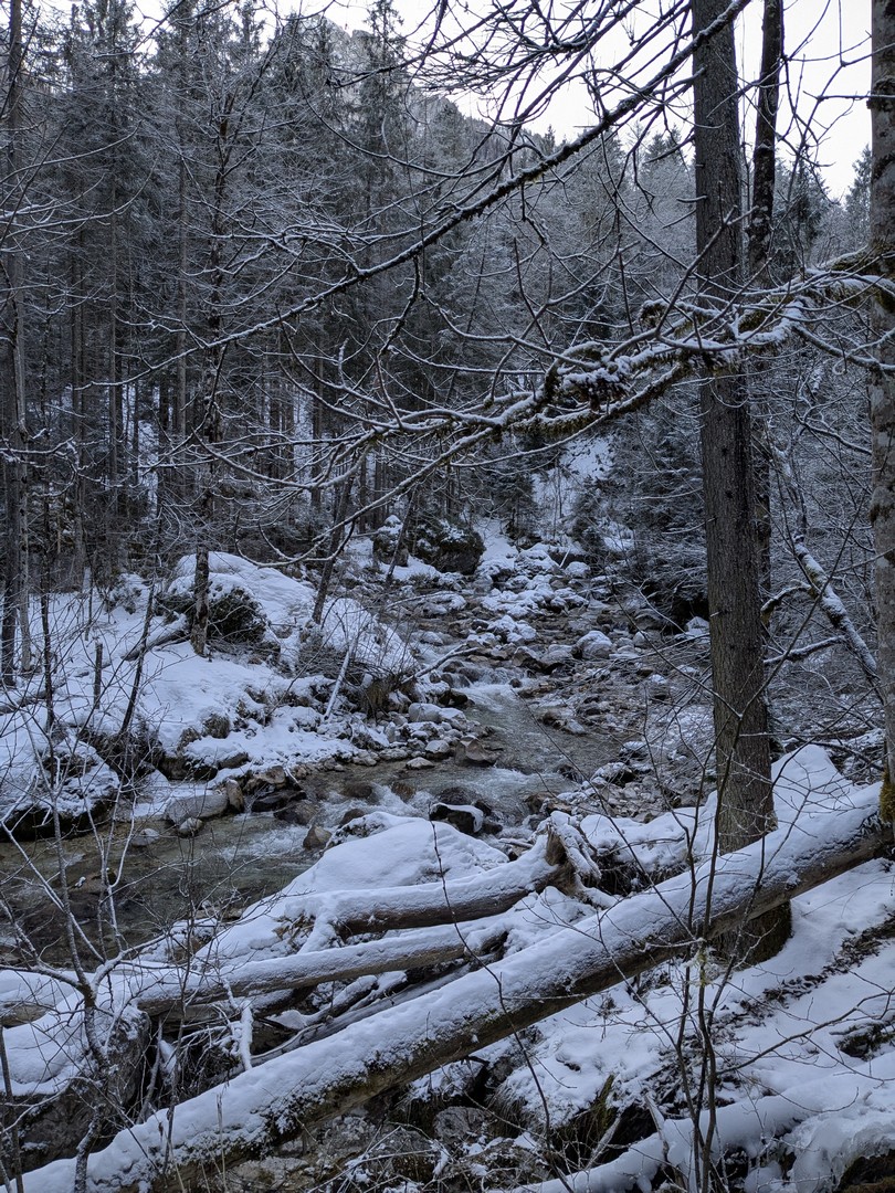 Wenn man aus dem Zauberwald kommt, steht man am Hintersee. Dieser war zu unserer Überraschung zu großen Teilen gefroren. Durch den leichten Schneefall am Tag vorher konnte man an manchen Stellen gar nicht erkennen, wo Ufer und wo See war. Der Anblick des Sees hat uns begeistert.