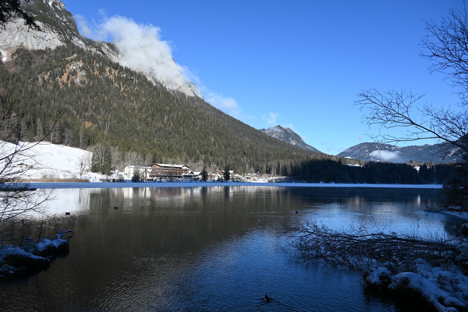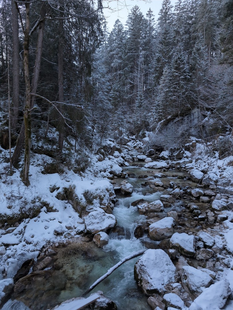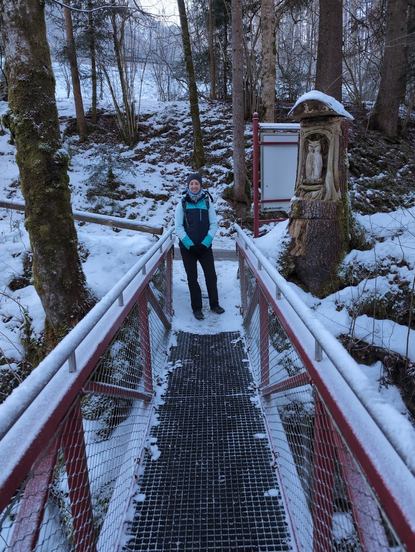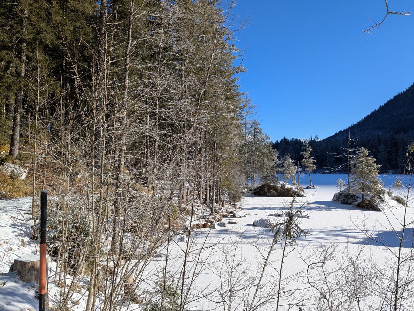 Wenn man aus dem Zauberwald kommt, steht man am Hintersee. Dieser war zu unserer Überraschung zu großen Teilen gefroren. Durch den leichten Schneefall am Tag vorher konnte man an manchen Stellen gar nicht erkennen, wo Ufer und wo See war. Der Anblick des Sees hat uns begeistert.