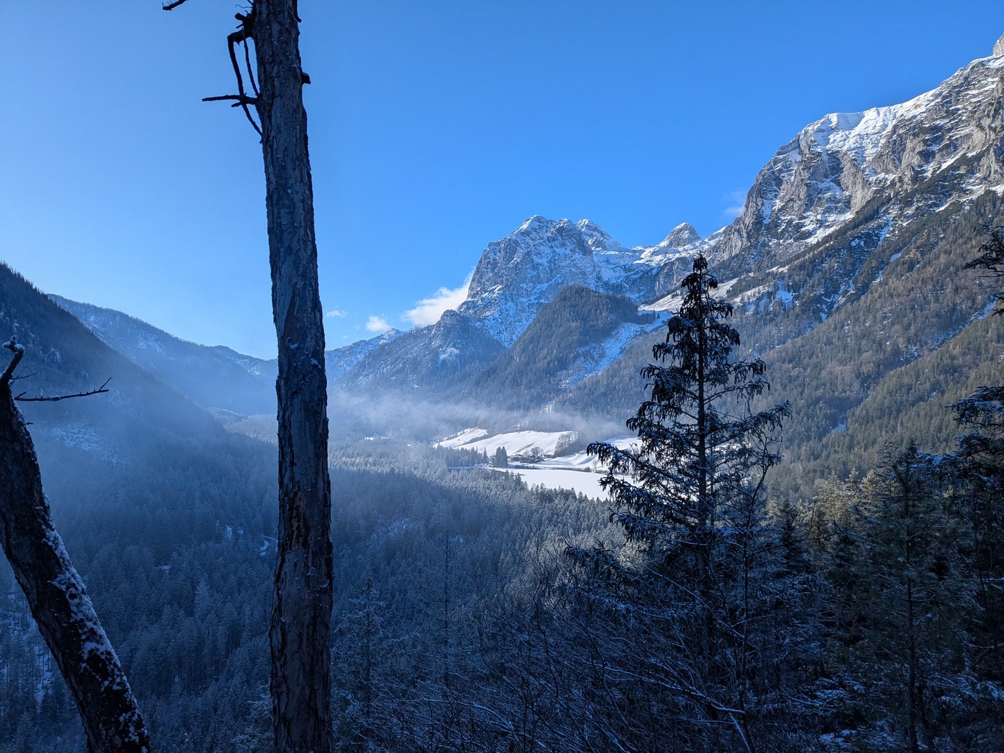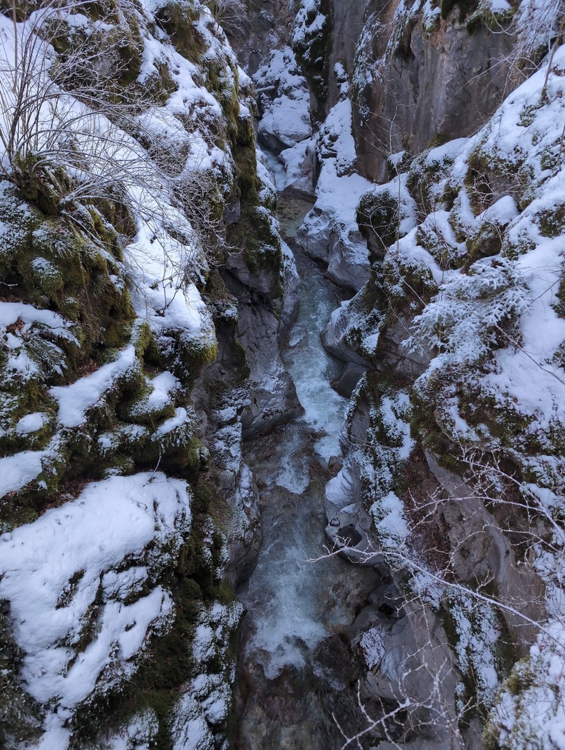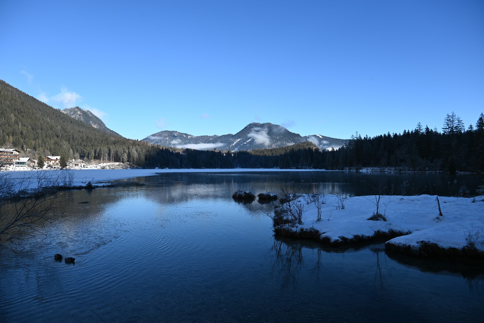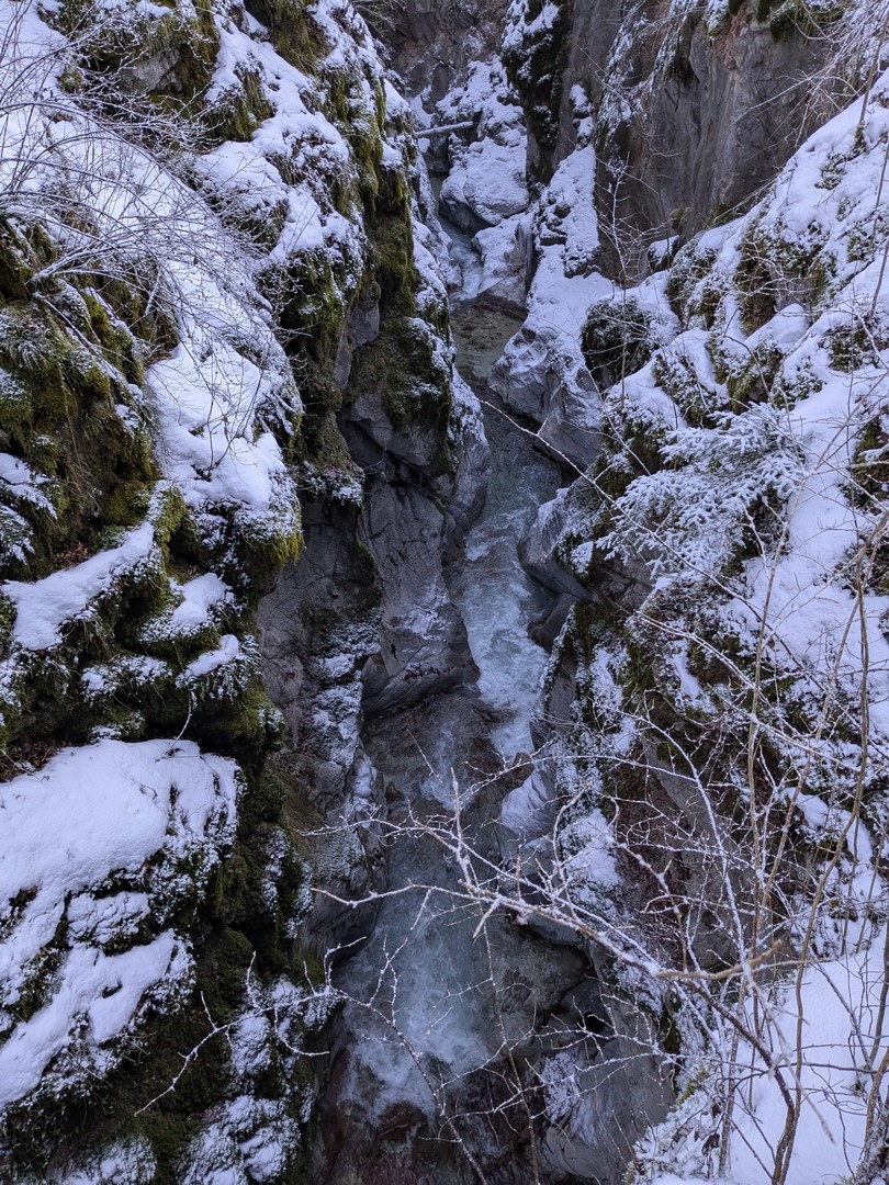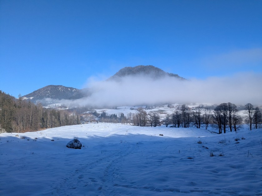 Wenn man aus dem Zauberwald kommt, steht man am Hintersee. Dieser war zu unserer Überraschung zu großen Teilen gefroren. Durch den leichten Schneefall am Tag vorher konnte man an manchen Stellen gar nicht erkennen, wo Ufer und wo See war. Der Anblick des Sees hat uns begeistert.