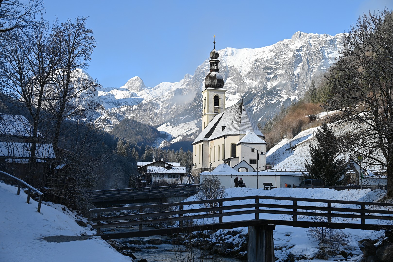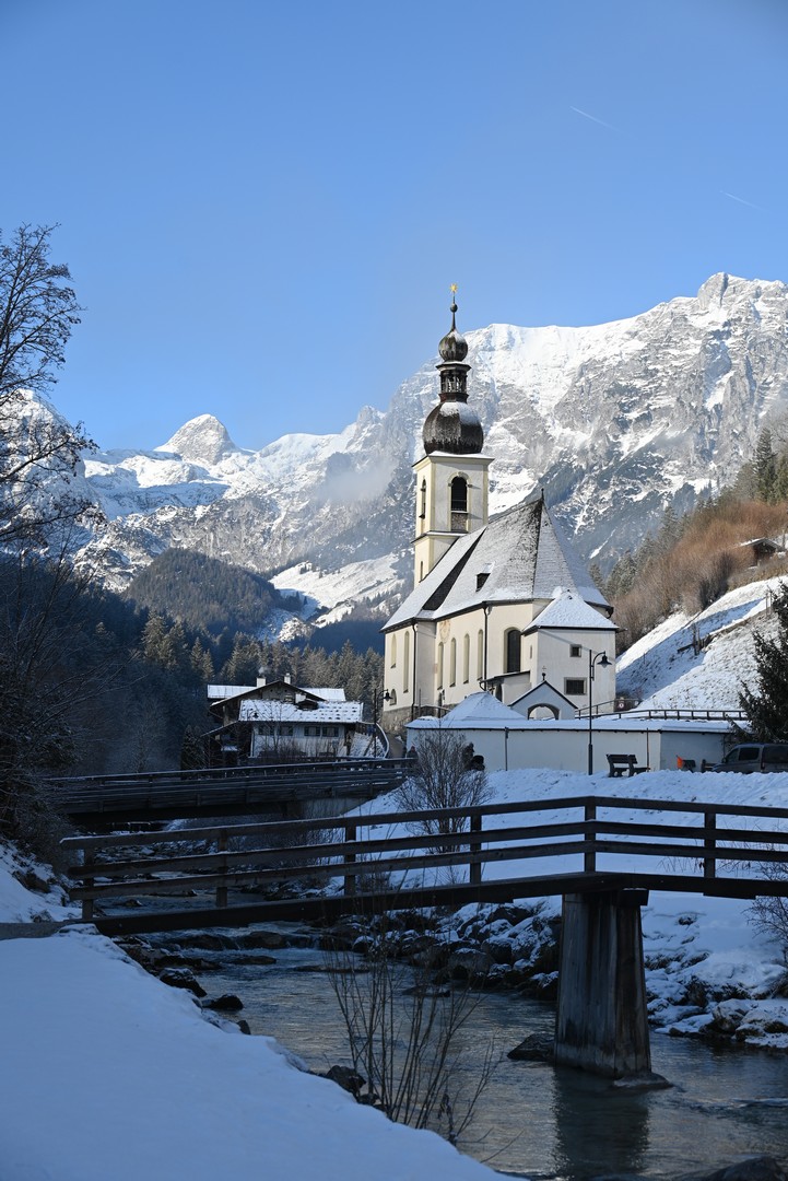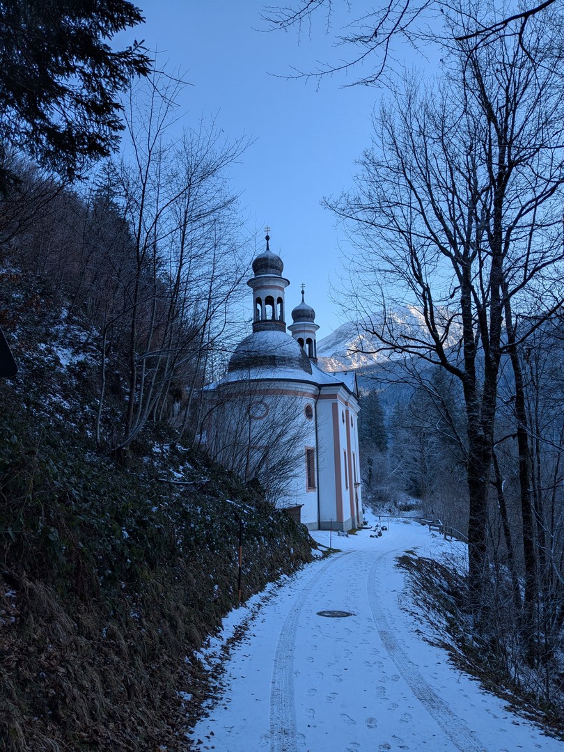 Am Donnerstag brachen wir zu unserer Lieblingswanderung dort auf, dem Malerweg in Ramsau. Wir fuhren mit dem Bus nach Ramsau und je weiter wir fuhren, desto mehr kam die Sonne raus. Die Wanderung führt zunächst durch den Ort an einer kleinen Kirche vorbei.